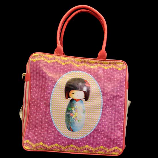 This pretty travel bag comes in a rectangular shape with two orange straps. The body of the bag is embellished by a cute wooden Japanese doll inside an oval ornament. With dotted patterns all over, it looks more unique. Carry this gorgeous bag to your trip.