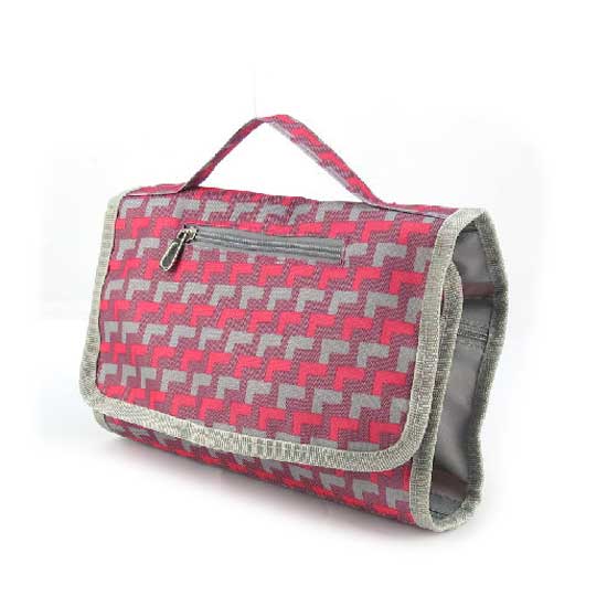 This travel cosmetic bag features geometric patterns in pink and gray for a stylish touch. It comes with a zipper pocket at the front and 3 inner zipper pocket. With a handle on the top, this polyester cosmetic bag can be easily carried.