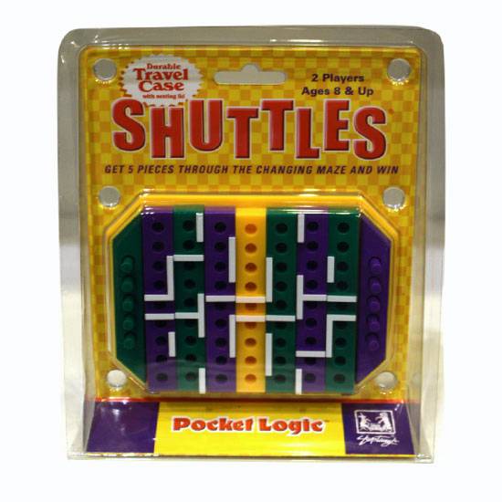 The travel game, Shuttles, is ready to play anytime you travel. It has a durable case with a nesting lid for enhanced protection and portability. Take turns and be the first to get 5 pieces through the changing maze to win.