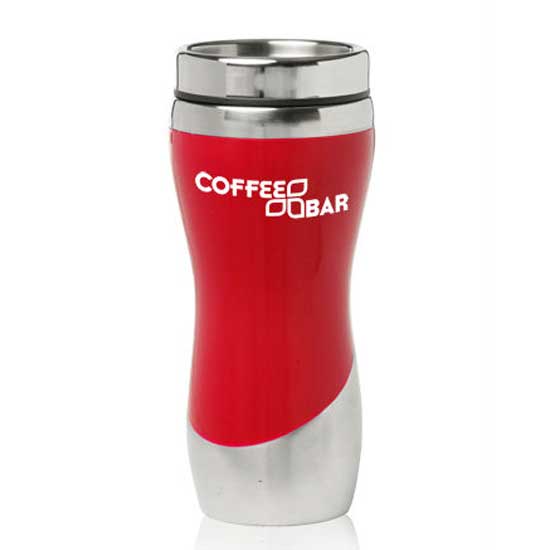 This travel mug features a curved shape for an easy, comfortable grip. The sharp red color looks smart and warm. This metallic mug is a durable product for use at home, school and at work.