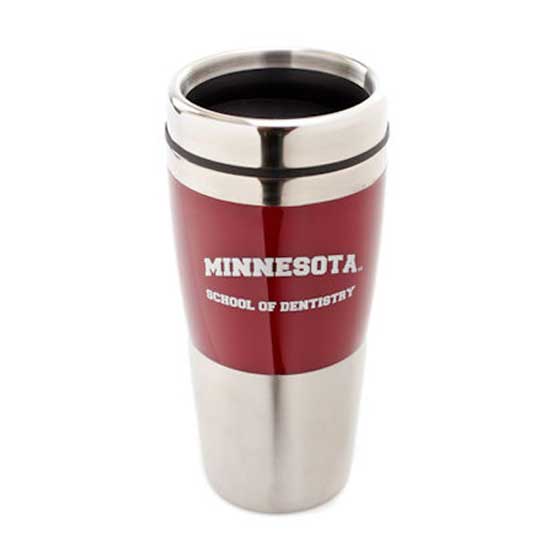 This is a travel mug that is made with a metal housing in a highly glossy finish. The two-tone design in silvery and red showcases a striking effect. This stylish mug is highly durable and practical for travel use.