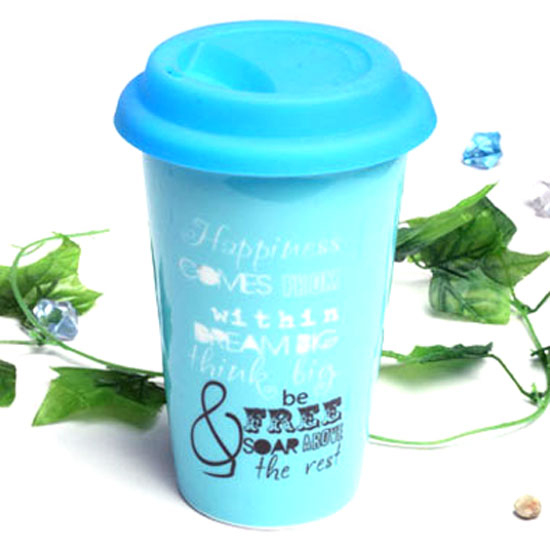 Displayed is a travel mug coming with an all-blue finish. It is printed with meaning words and phrases to inspire you and cheer you up. It comes with a just-fit lid to prevent liquids from spilling out.