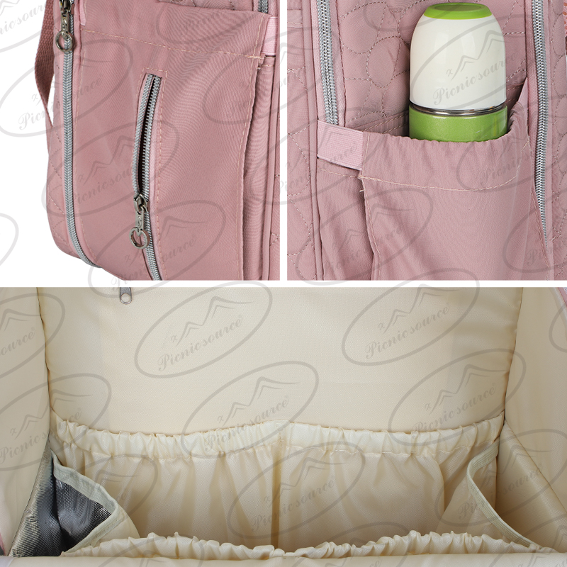 Two side pockets, one with zipper opening for tissue,another one for bottle.