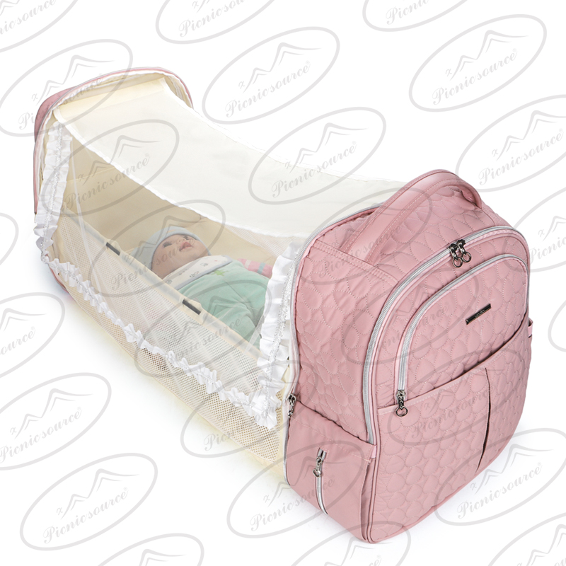 Opening backside zipper compartment to be safe and comfortable baby sleeping bed that also includes mosquito net.