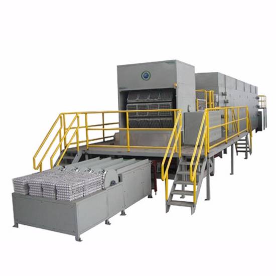 This is a machine for making egg tray, egg carton, egg box and fruit tray. There are 4 pieces of 30-cell egg tray molds which can be mounted on each forming platen (4 pcs/cycle). The machine consists of 12 forming platens and 1 transfering platen.