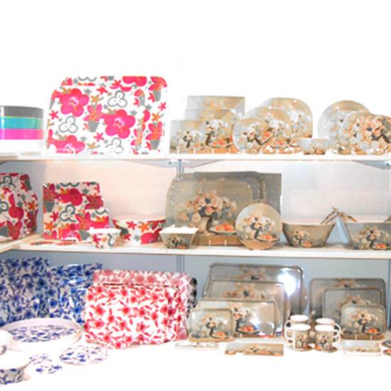 These are trays and tableware with different backgrounds. The tray and tableware in same background is in a set. As they are made of melamine, they insult heat and are less easy to be broken. These trays and tableware are elegant and noble.