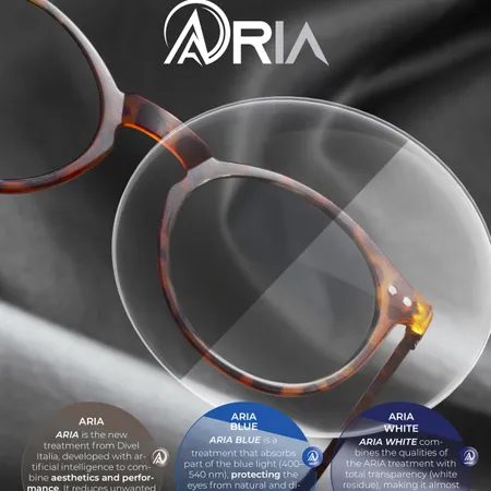 Treatment ARIA: A next-generation anti-reflective coating that redefines the vision experience. ARIA is the latest of Divel Italia's treatments, created through the use of artificial intelligence in order to achieve the best combination of visual aesthetics and performance. The ARIA treatment is characterized by a low residual surface reflection, in addition to all the other features found in the other treatments, which ensures maximum visual comfort by eliminating all unwanted reflections.