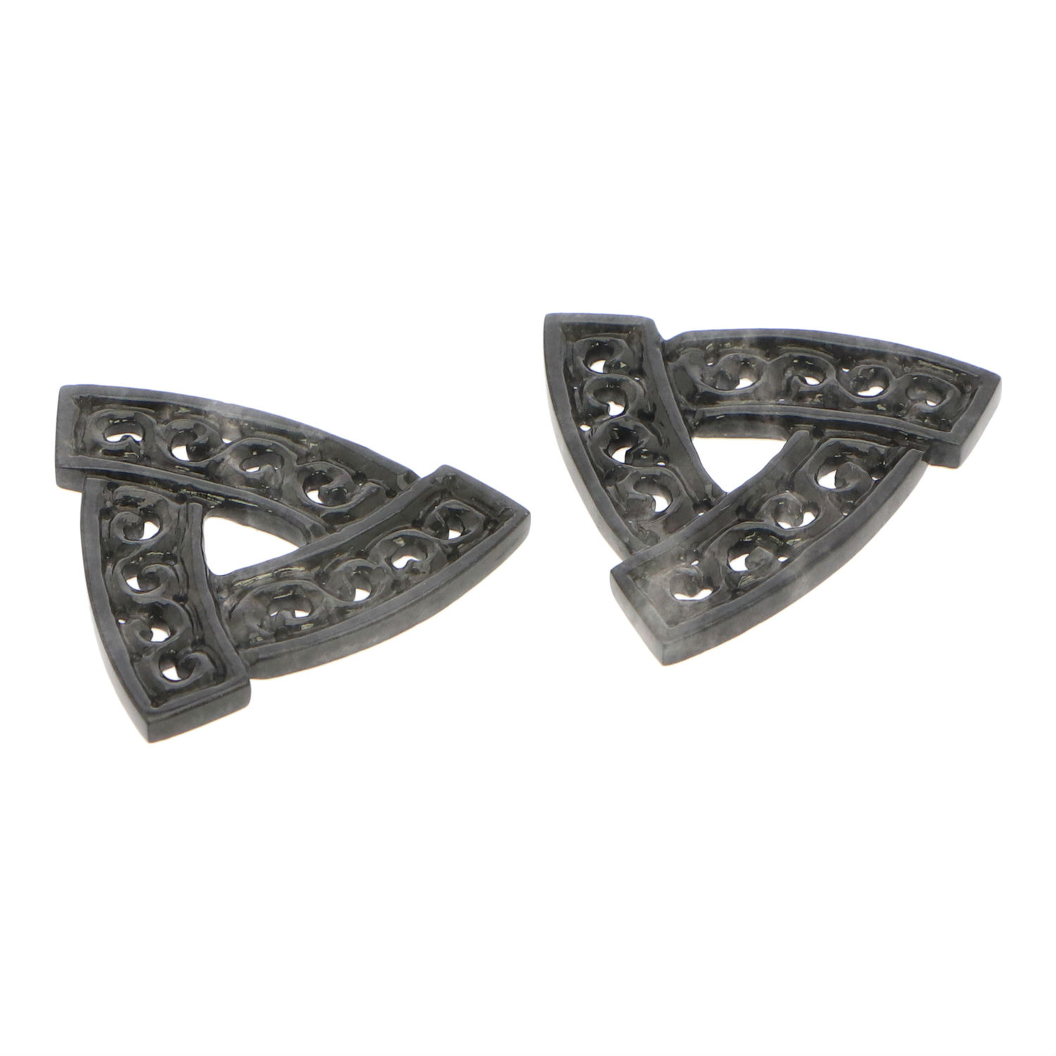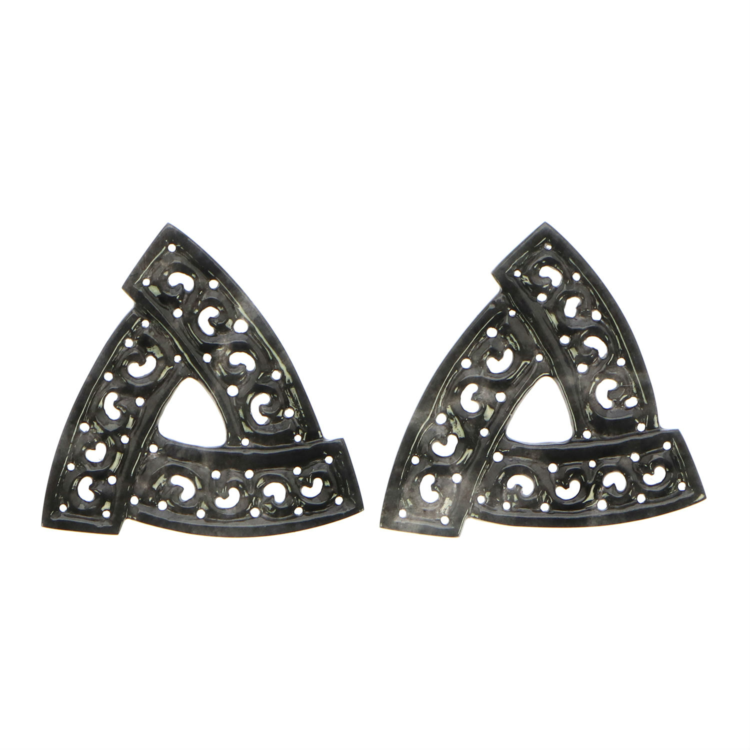 Modern silhouettes harmonize with ancient materials in these refined and whimsical earrings. Handcrafted from natural type A black jadeite jade mined in Myanmar, this pair flaunts a unique triangular shape for a contemporary and urban look. The modern design is handcrafted on antique-looking black jadeite jade for an old-world touch. Blending elements of old and new, this pair will create a delicate yet striking impression.