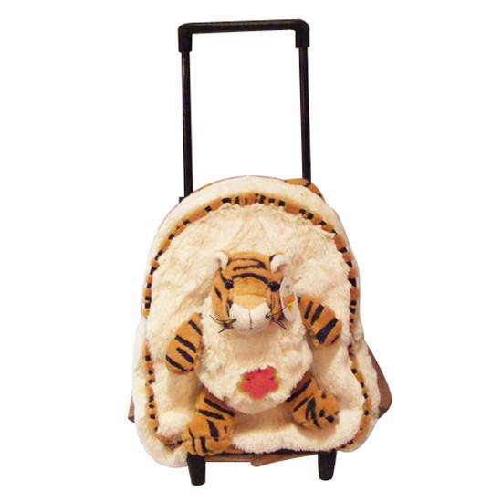 The trolley bag is designed for children and young students. A tiger is attached on top and the bag is decorated with tiger patterns. Moreover, straps are attached at the back for bearing on shoulders.