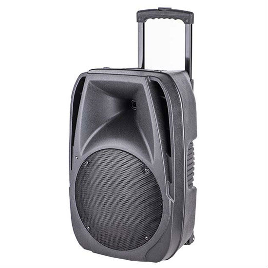 Displayed is a trolley PA system featuring a stylish and chic look. It features a powerful driver unit to allow people to address a large crowd of people. It is perfect to use in sports stadiums, train stations and school halls.