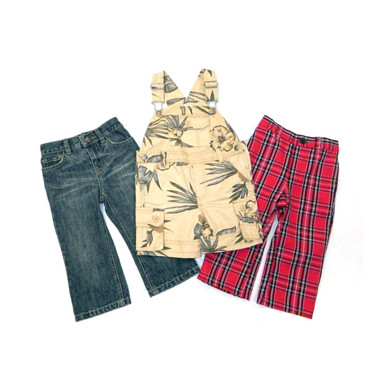 Showcased are pairs of jeans, plaid trousers and patterned dungarees. The jeans are styled with darts for fashionable shabbiness. The plaid trousers in sharp red offers a gentle yet trendy feeling. The dungarees come with matching leaf patterns against its unassuming background.