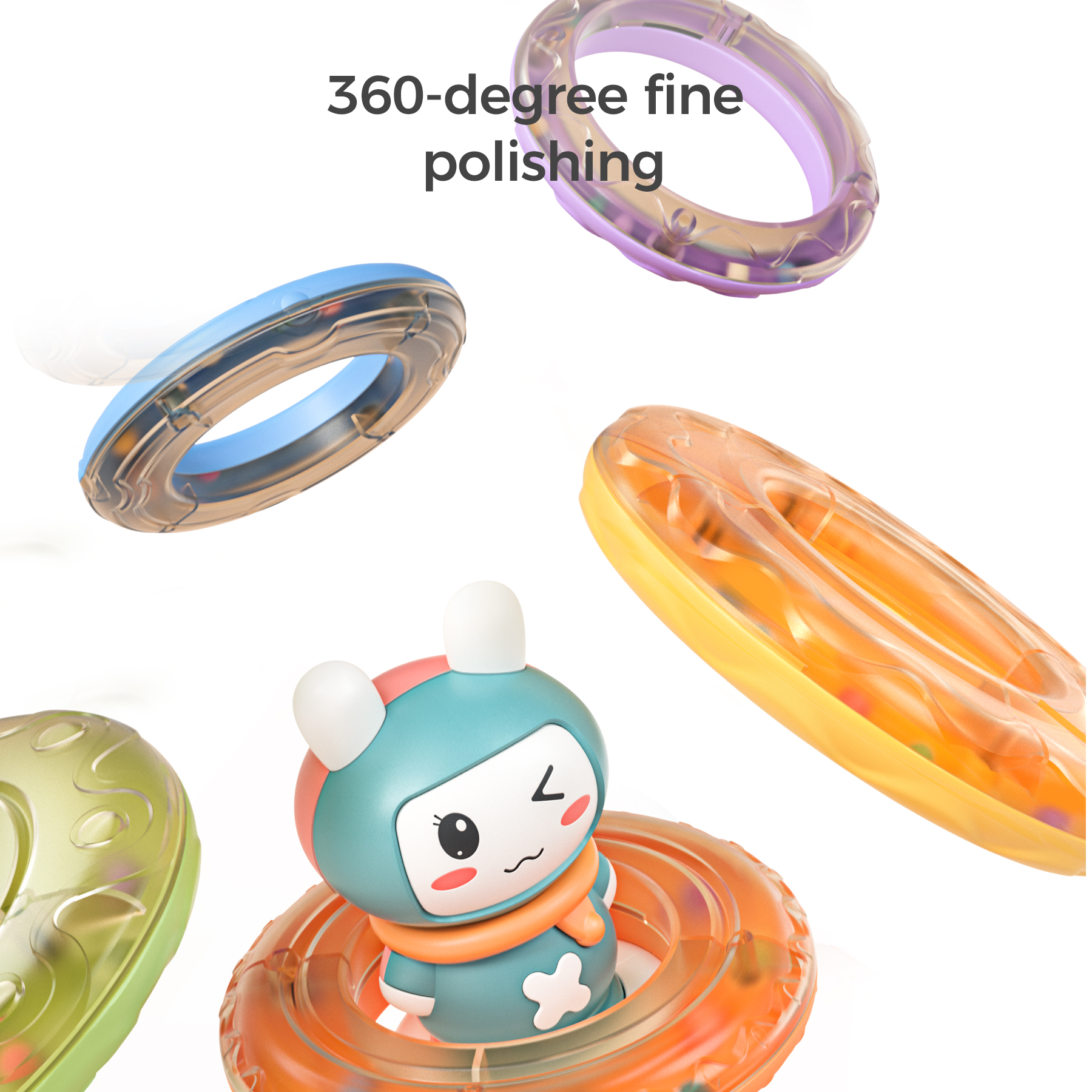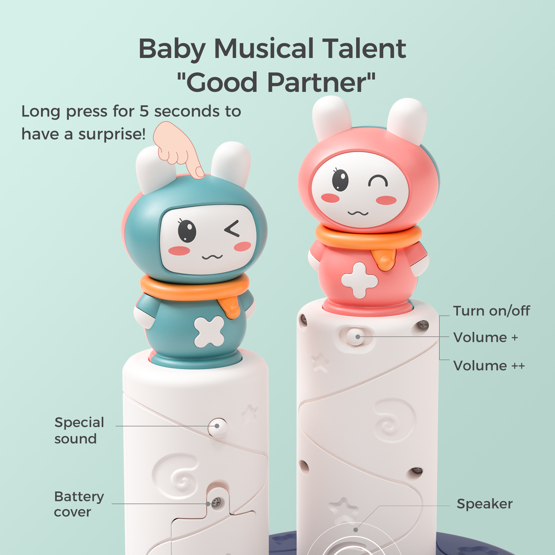 【Baby-Toddler Musical Rings】Colorful and musical toy with Rabbit Charectar Head.Combination of music sound and light effect.Press the cute and friendly rabbit character to learn colours,numbers,shapes and to hear encouraging phrases.Tap the small head for 1.5 seconds,there are five modes,30 songs(Chinese and English nursery rhymes piano.Funny cartoon dubbling,music box,English nursery rhymes),tap for more than 1.5 seconds switch to the next mode.