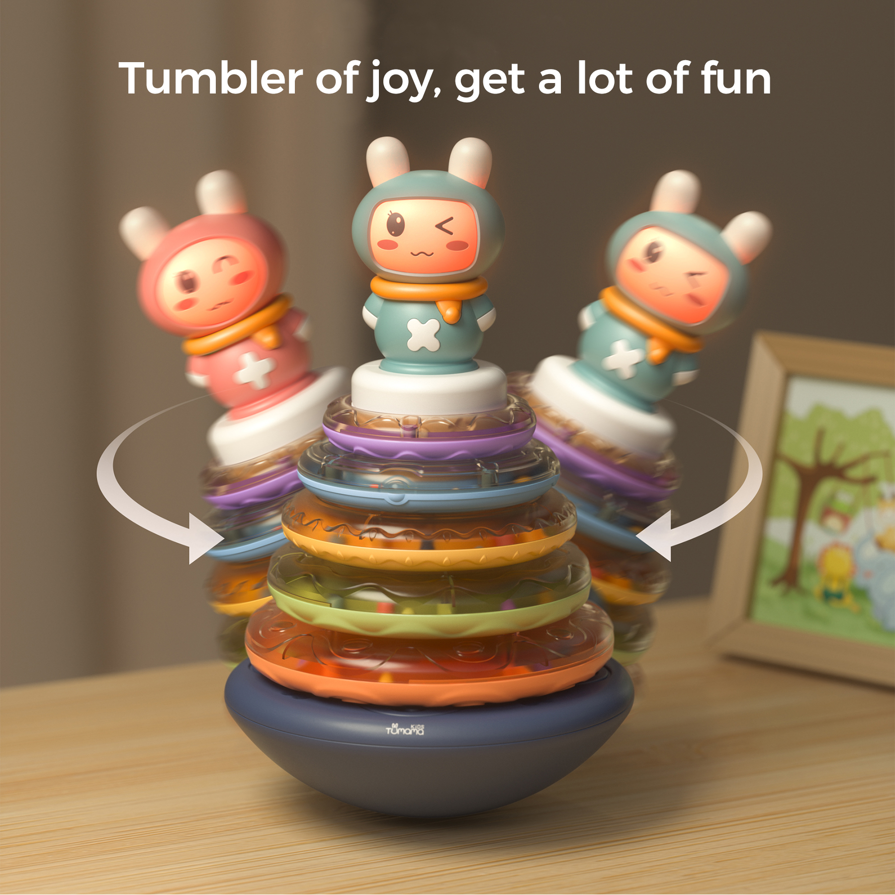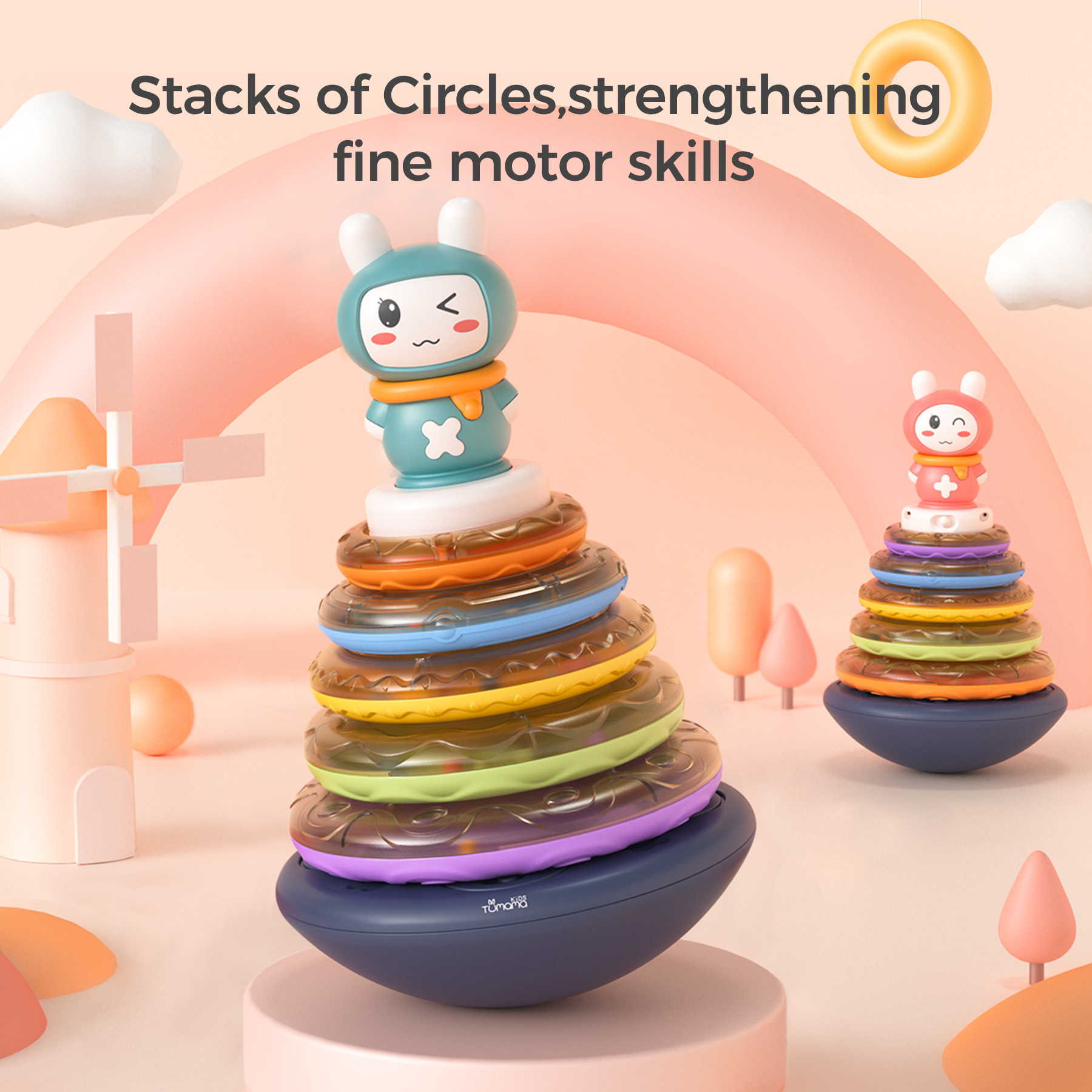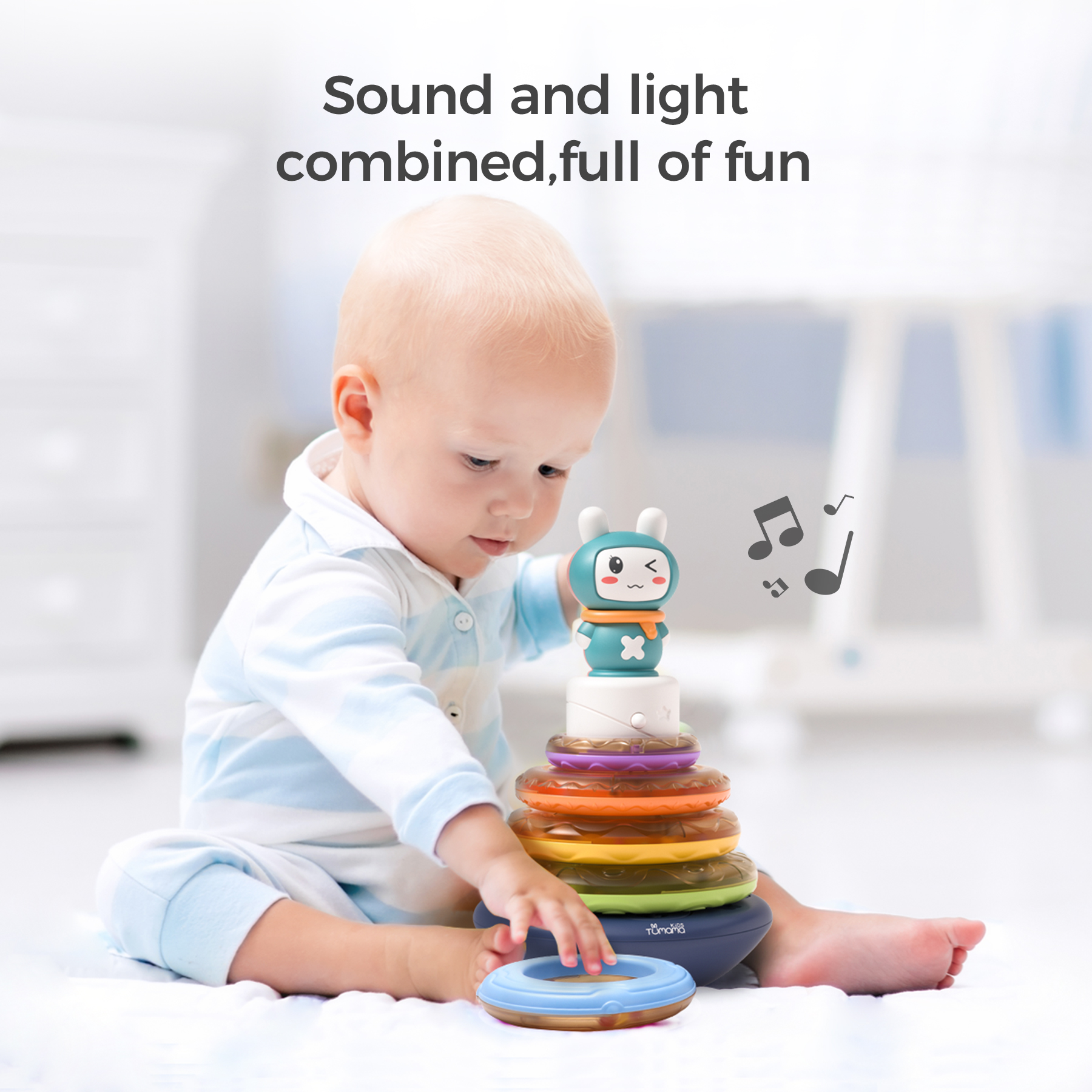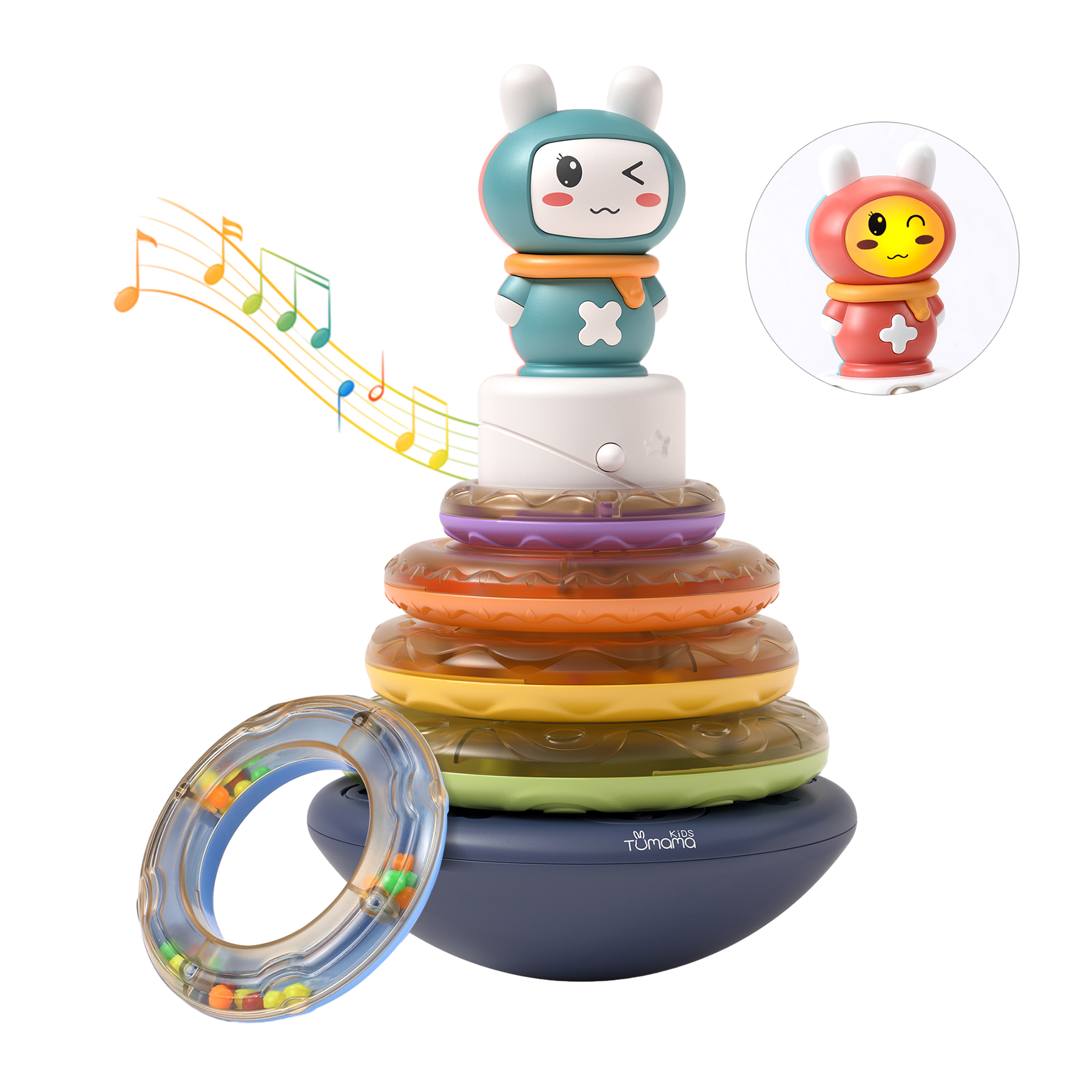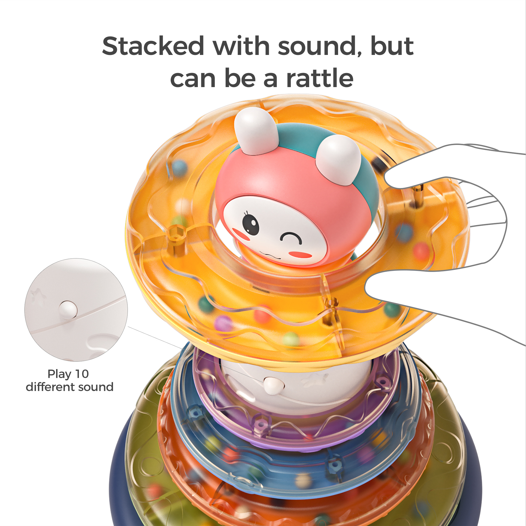 【Baby Stacking Toys】This is a big take on the classic toy for babies.5 colourful stacking rings for your baby to grasp,shake,stack and explore.Lots of songs to sing along to and robust rings.Place the rings on the wobbling base to discover fun sounds,interactive phrases and sing-along songs.Typical bright and well made ring stack toy,there are two settings for volume so you can put the toy on a quieter mode.