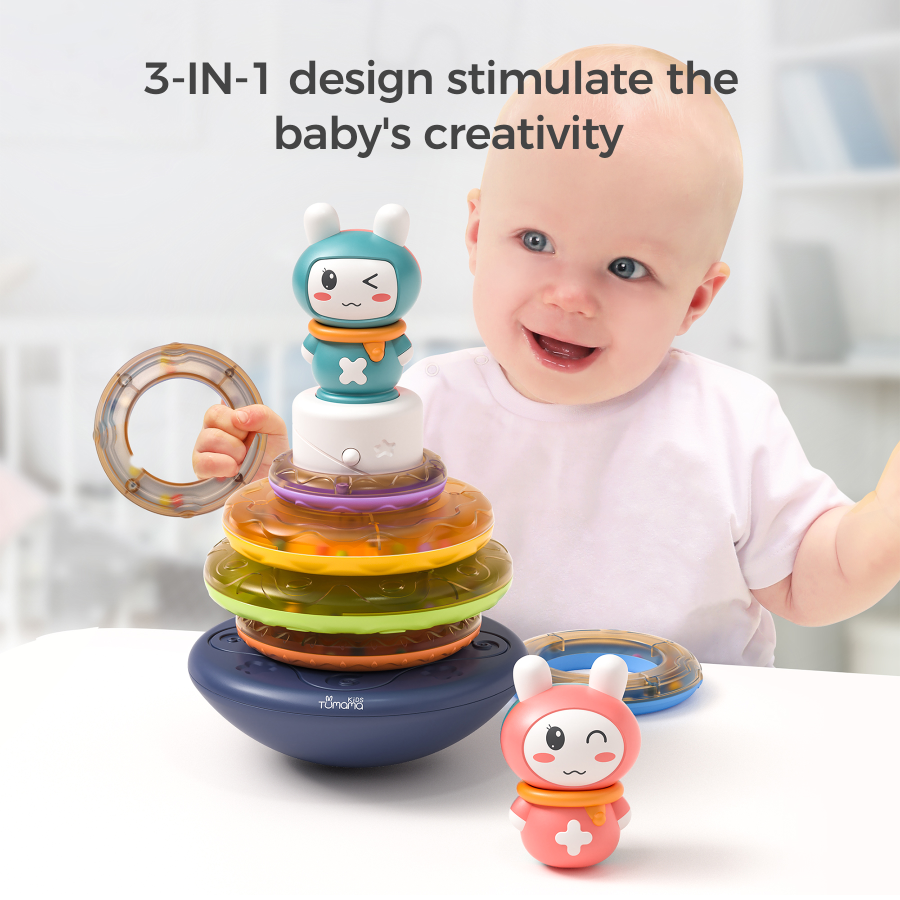 【Brightly Coloured Pieces】This baby ring stacker features brightly coloured and smoothly sanded pieces with rattling beads inside to help keep baby amused that help children build early shape,colour,and size-differentiation skills.Train your baby to identify color,math early educational,touch and feel,Good for coordination and fine motor skills and creativity.The base wobbles to make it more fun and challenging.