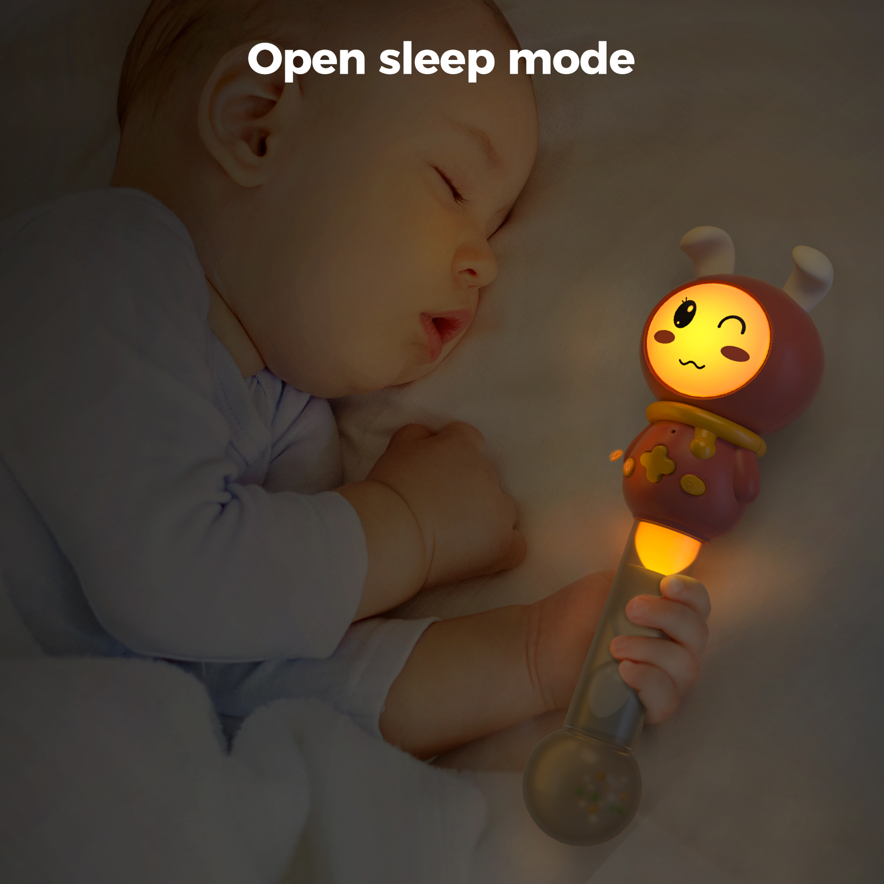 【Sleep Soother for Baby】Soft light and music lulls your little one into a relaxing soothing sleep,auto off in 30 mins.Requires two 1.5V AAA batteries,the batteries not included in package.Toy for 6 month old baby and older.Rattle toy size:2.8*9inch.