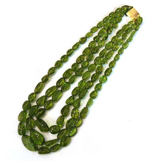 The necklace is strung with finely selected and processed tumbled peridot stones. The stones come in assorted shapes and a pleasing green hue, offering a touch of primal beauty. This necklace will highlight your neckline with unspoken charm and elegance.