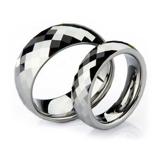 This tungsten ring set is a perfect symbol for eternal love of couples. Made from rare tungsten metal, the rings are scratch and tarnish resistant. The faceted ring surfaces exhibit long-lasting shine.