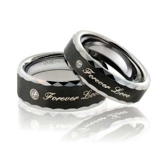 These tungsten rings are treated with black plating on the surface. Engraved with the words Forever Love, these tungsten rings are perfect engagement ring choices for couples. The durable and scratch-resistant rings can withstand daily wear.