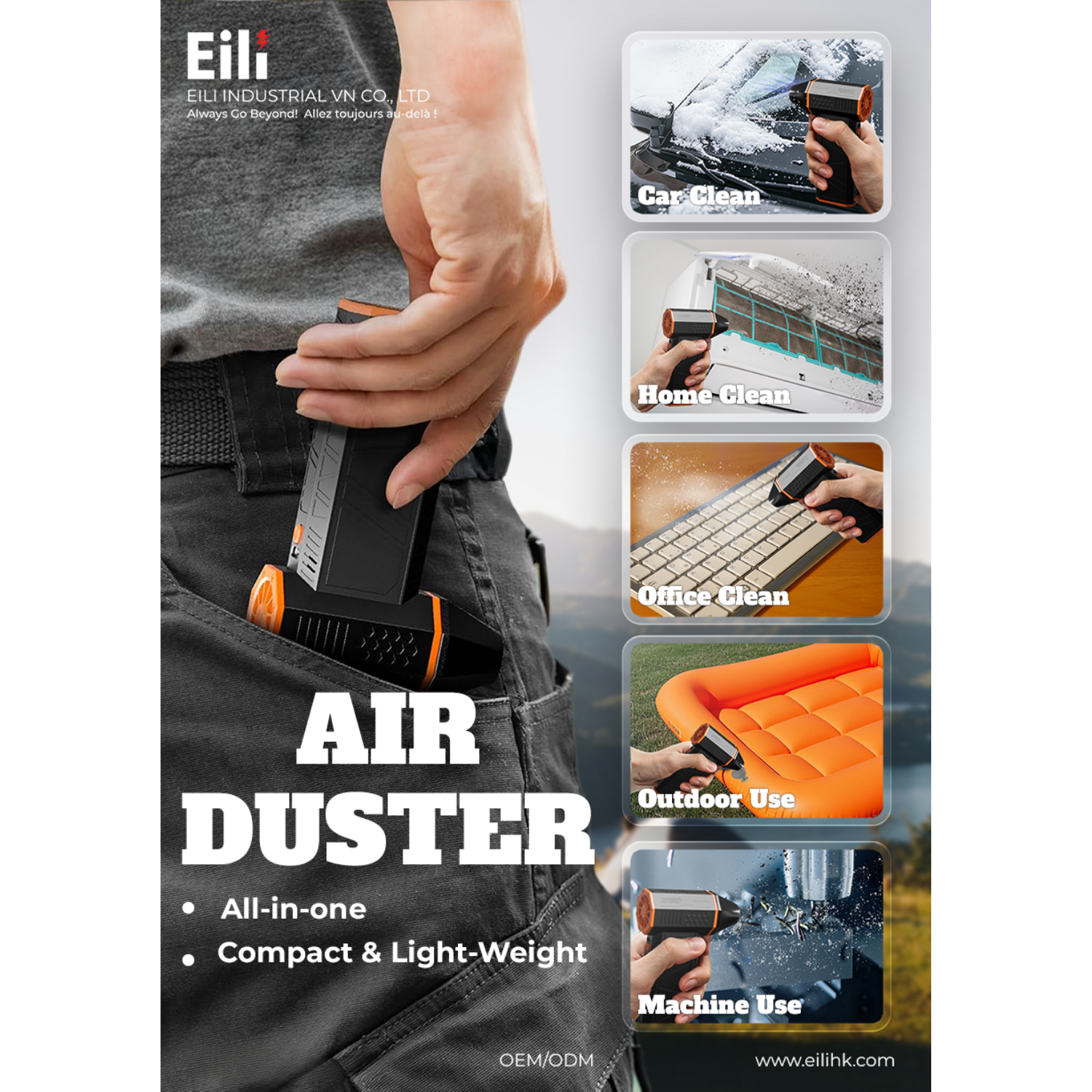 The Turbo Fan Air Duster is a compact and eco-friendly solution for replacing canned air. Powered by a 120W motor reaching 120,000 RPM, it offers three adjustable speeds for versatile cleaning. With a 7.4V rechargeable battery lasting up to 4 hours and Type-C fast charging, it’s efficient, portable, and smaller than an iPhone 14 Pro Max — ideal for both home and professional use.