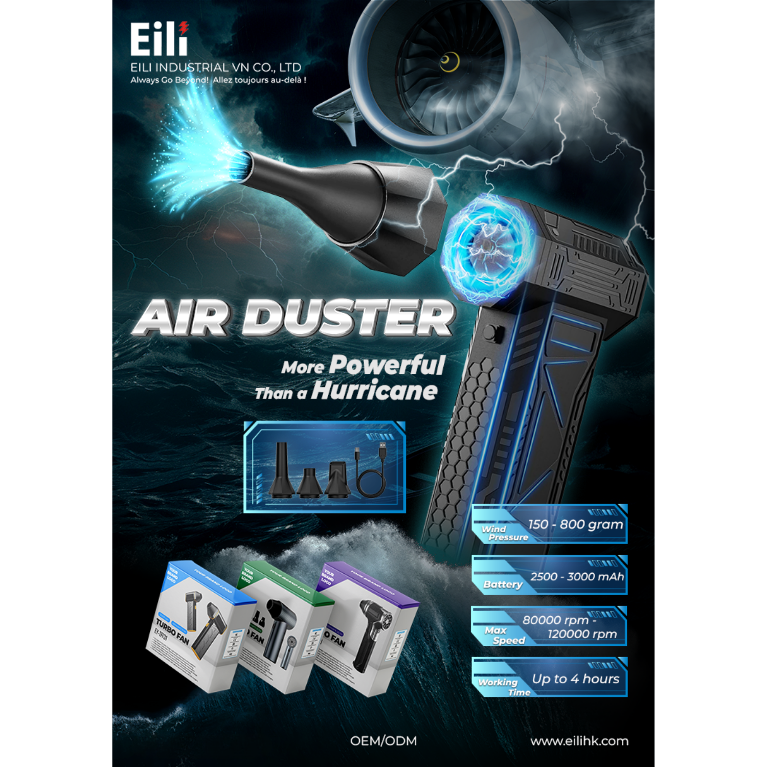 The Turbo Fan Air Duster is a compact and high-performance cleaning tool with a 15W brushless motor reaching up to 110,000 RPM. Powered by a 12.6V battery pack, it delivers up to 4 hours of runtime, three adjustable speeds, and Type-C fast charging—making it ideal for electronics, keyboards, and professional use.