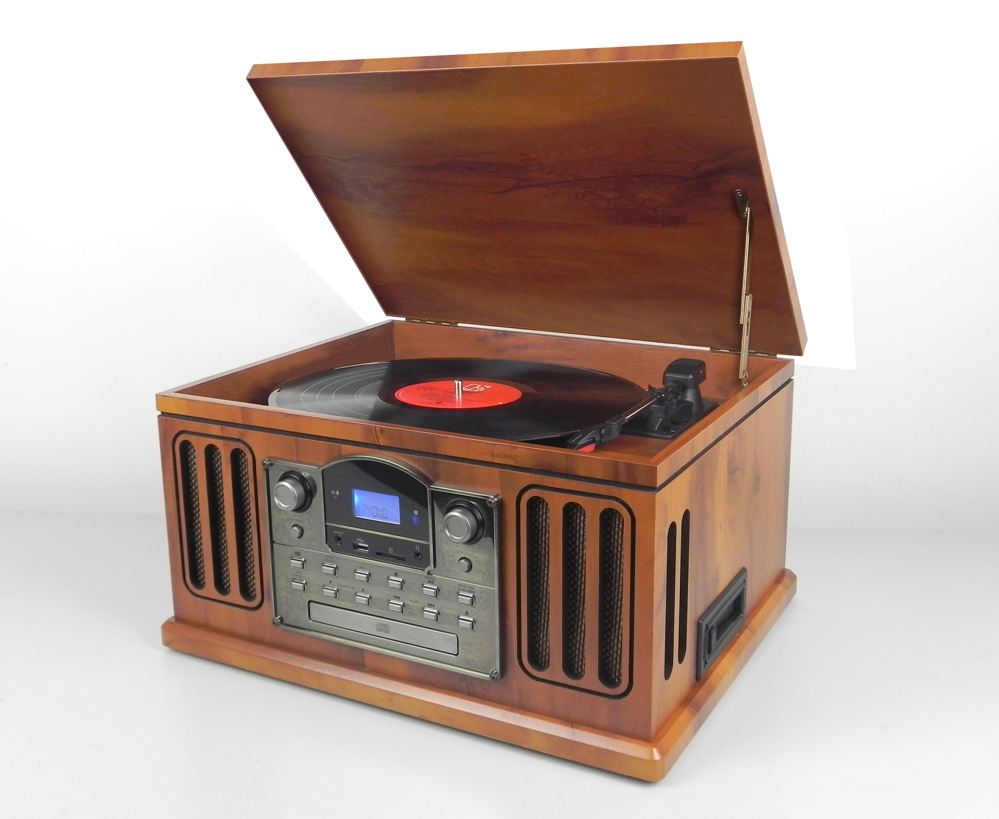 This 6-IN-1 Turntable system is equipped with varies features which allows you enjoy your music from Turntable, CD, USB drives, DAB / FM radio, Cassette and Bluetooth device via wireless streaming. The distinctive design with a wooden case makes it a perfect complement in your home or office setting.