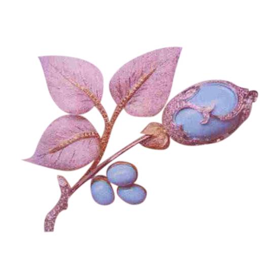 This is a turquoise and diamond brooch for ladies and women. Four cabochon turquoises are mounted on a plant stem as fruits. Adorned with small white and yellow, the brooch has a botanical design which resembles a piece of blue rose.