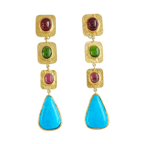 This is a pair of earrings that comes with a fashionable and elegant design. The colorful stones add a touch of glamor to the whole piece. This pair of earrings shimmers with a high-gloss finish.