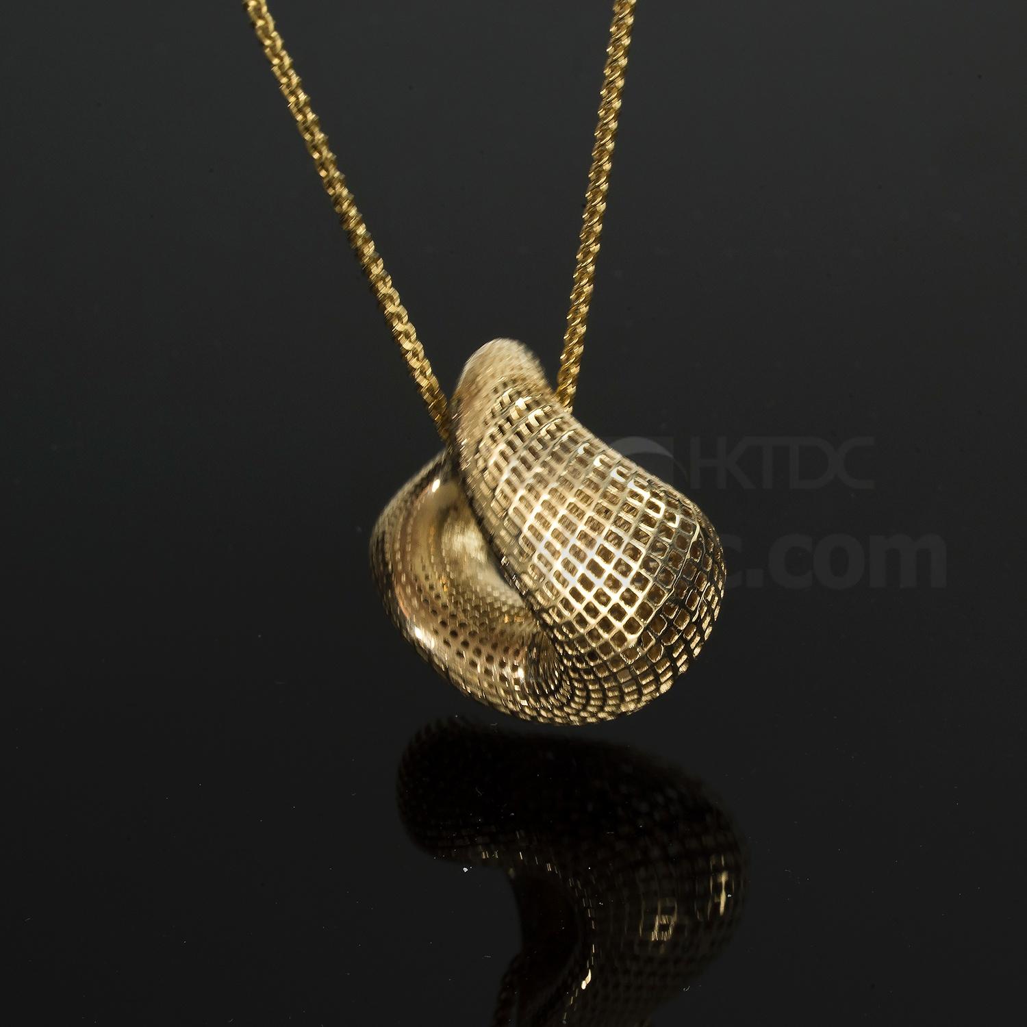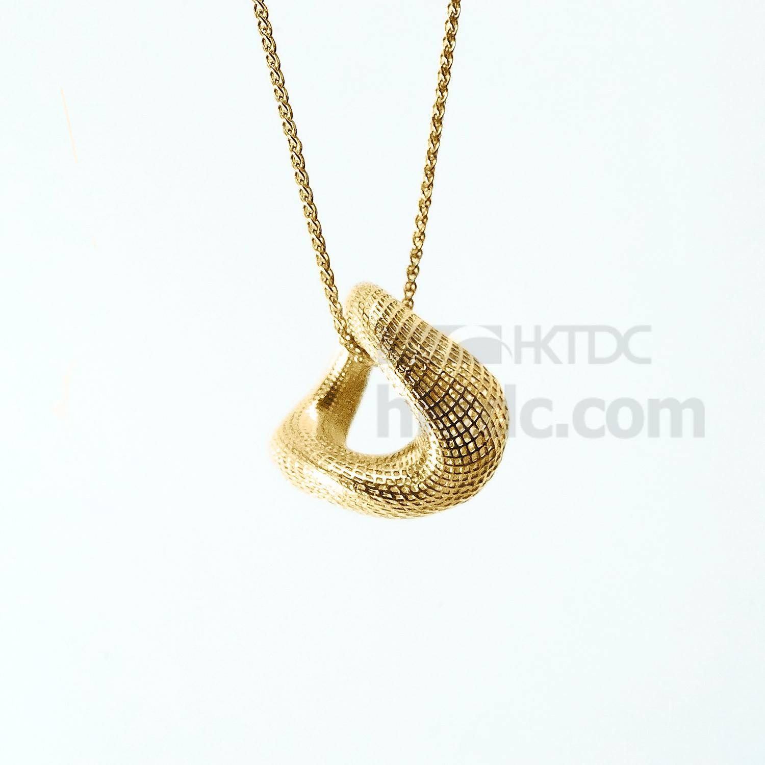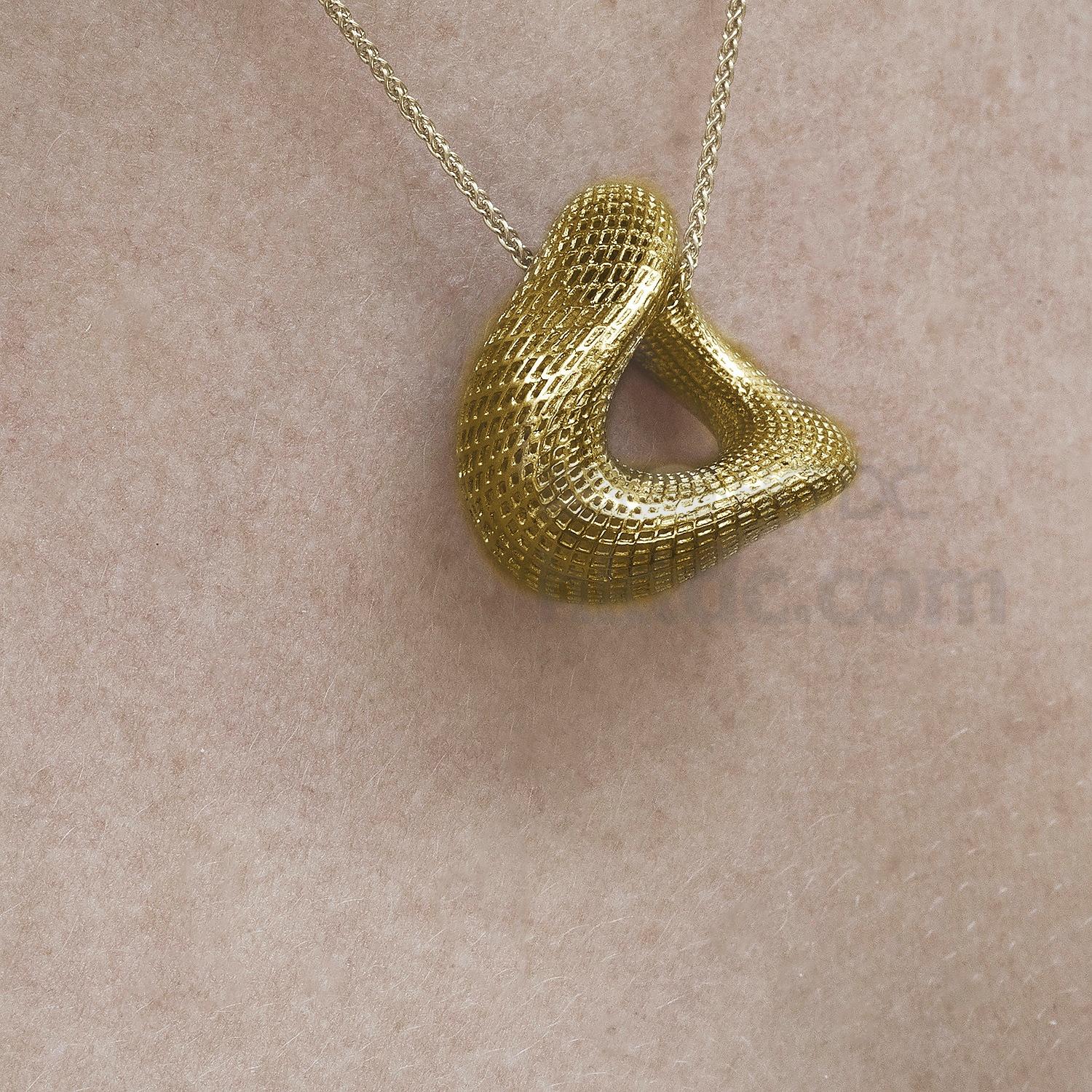 The twisted torus triangle pendant done in 3d technique. an amorphous shape made of wavy gold lines. contemporary elegant design.