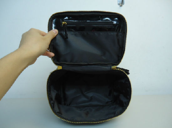 • Twill nylon with patent PVC two compartment cosmetic bag.