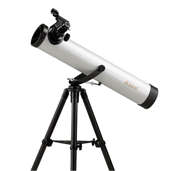 Pictured is a U-reflecting telescope with an elevated red dot finder. The fast-setup pre-assembled metal tripod is adjustable. The steel telescope tube is plated with rolled zinc in a pearl white finish.