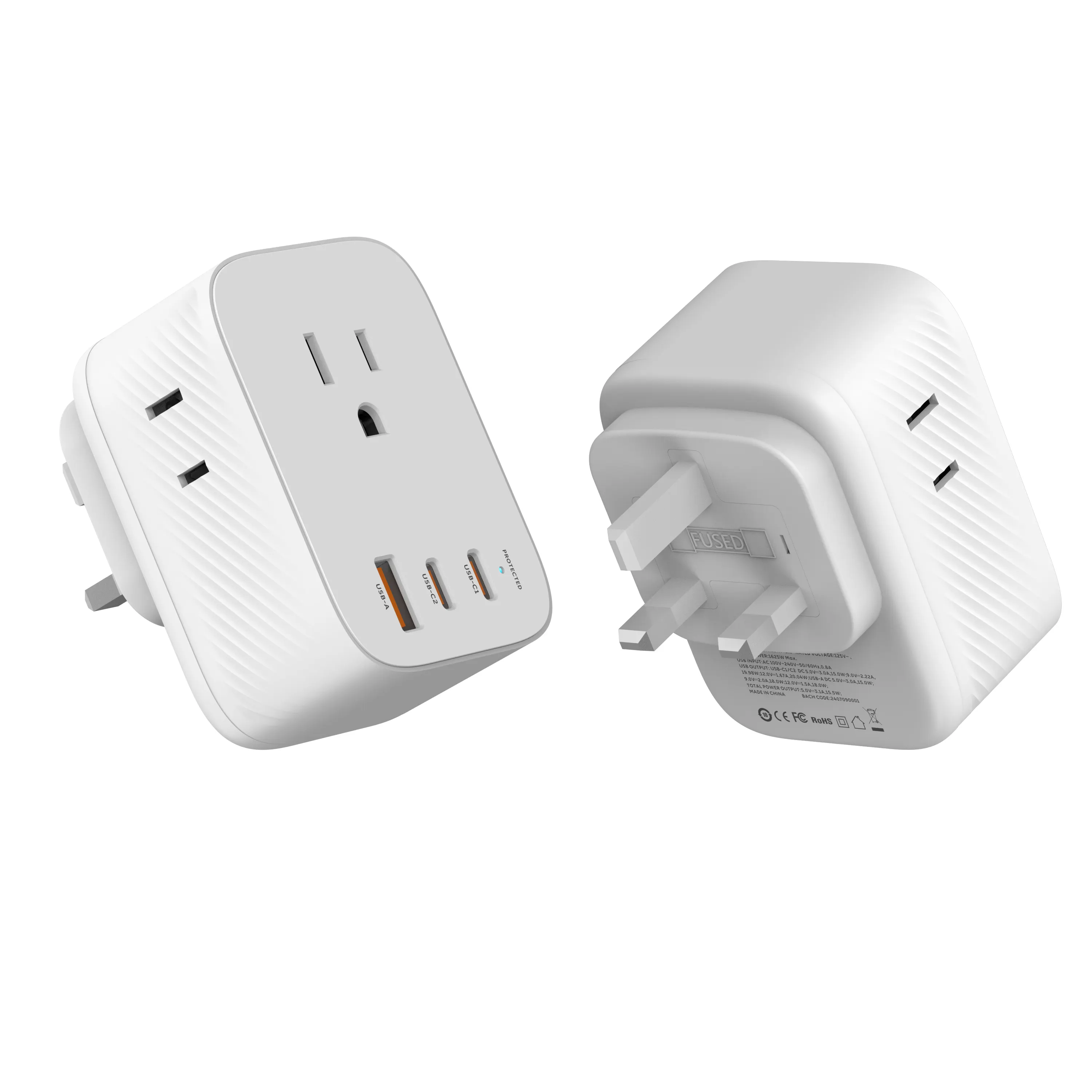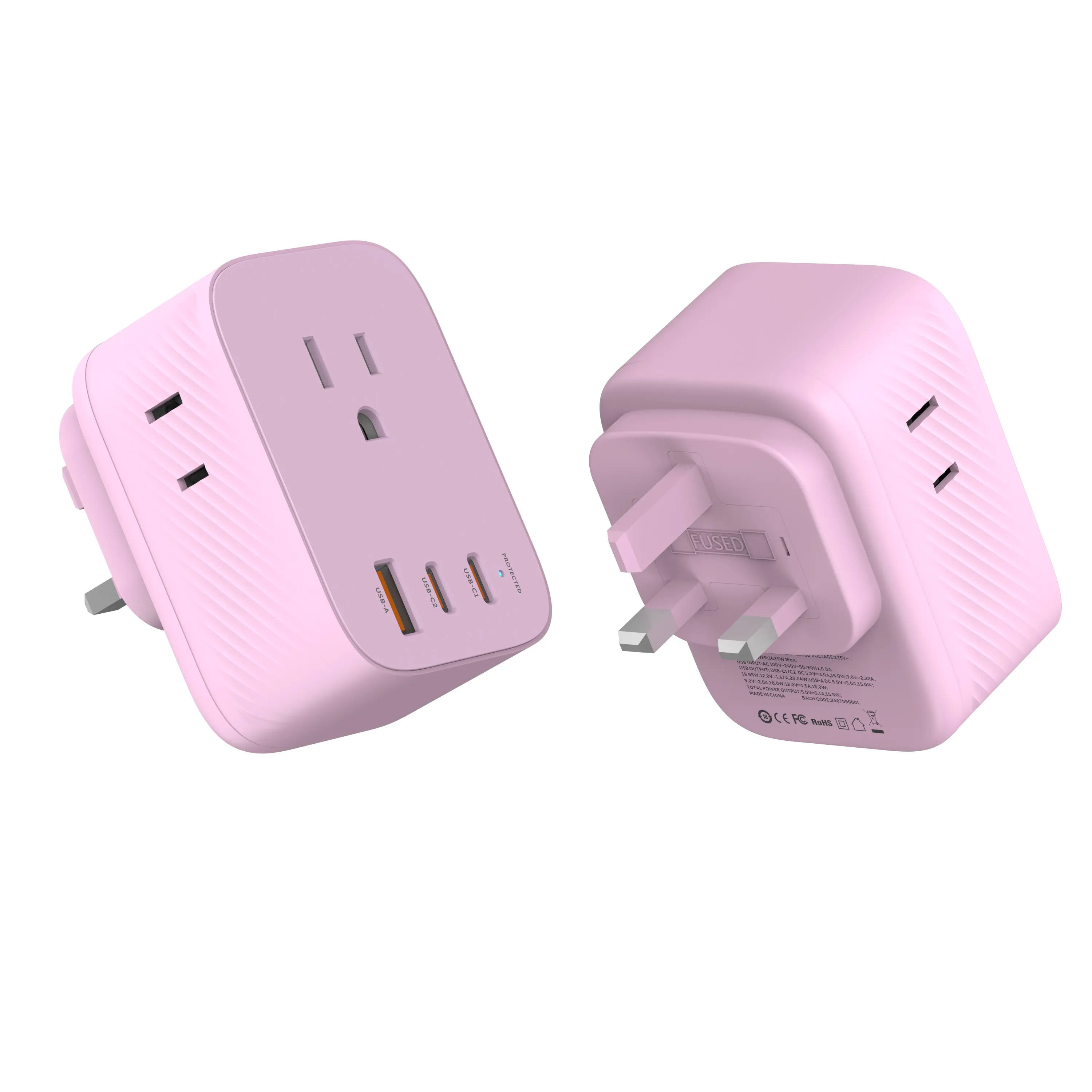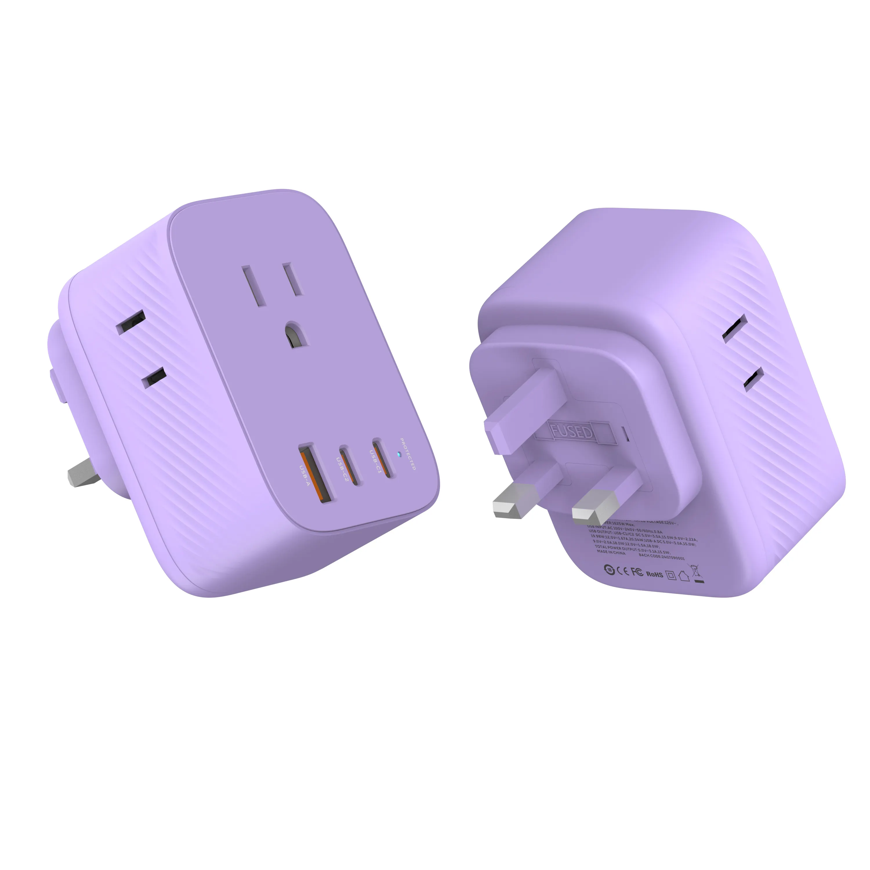 Travel plug adapter is a UK to US mobile phone adapter that supports 20w fast charging, has one USB A output ports, and two USBType-C ports.lt comes in five colors, which are White, Purple, Blue, Black and Pink. PC 94V-0 FIREPROOF Material. Compact andportable, it is a good companion for travelers.