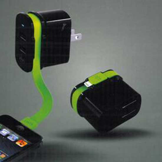 This is an electrical adaptor with a compact design suitable for travel use. It comes in black with a built-in lightning charging cable in bright green. This adaptor comes with two USB ports for added utility.