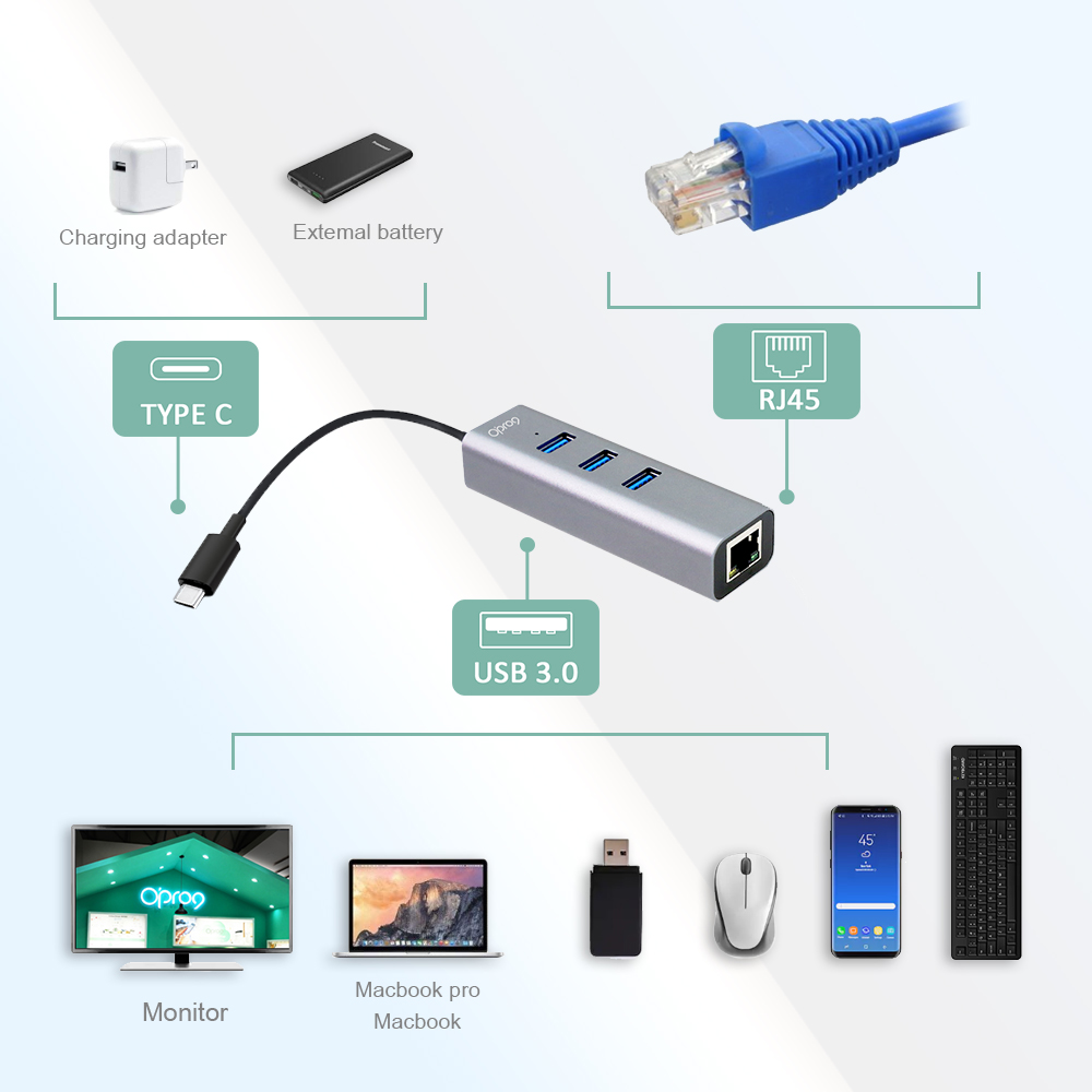Today, many laptops pursue a thin design – while desktops have ample space for USB ports, laptops must fit in a keyboard, touchpad, and other things surrounding the USB port with little space for expansion slots. To address this, Opro9 has created a USB-C to USB3.0 hub with external Gigabit network assembly and a USB 3.0 interface. It makes the user experience more convenient by allowing one to use up to three USB devices at the same time. It also supports the RJ45 gigabit Ethernet network with transmission speeds 10 / 100 / 1000 Mbps. It perfectly solves the problem of insufficient external expansion slots, expanding the laptop’s functionality and increasing productivity.