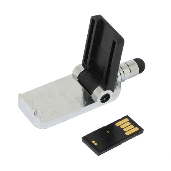 This is a USB drive that can be used as a phone stand. It features plug-and-play function and has a durable structure. This item is also designed with a stylus pen for enhanced functionality.