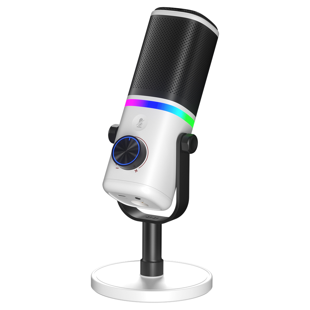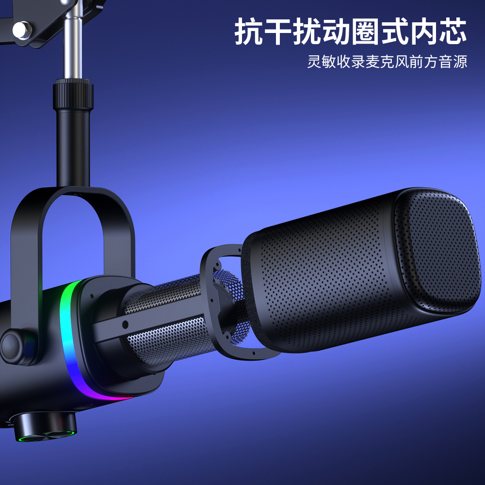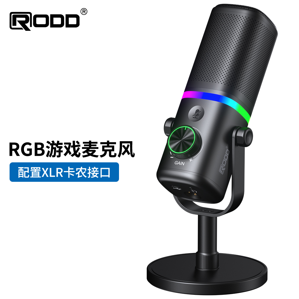 This is a multifunctional USB dynamic microphone with one-button mute, one-button noise reduction, plug-and-play functionality, and cool RGB lighting effects that can be freely switched between multiple modes, creating a vibrant atmosphere in the live streaming room. The microphone features an XLR microphone input, allowing connection to sound cards, mixers, etc., making it more suitable for gaming, live streaming, recording, voice-over, video voice chat, teaching, and other live broadcasts