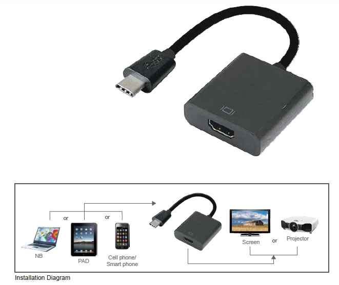 The USB Type-C to HDMI adapter enables you to connect a USB Type- C ALT DP-equipped desktop or laptop computer or cell-phone to an HDMI display. This adapter is compatible with USB Type-C ALT DP & HDMI 1080 and as a result can support video resolutions up to 1080P as well as the accompanying digital audio up to 7.1 channel surround sound.