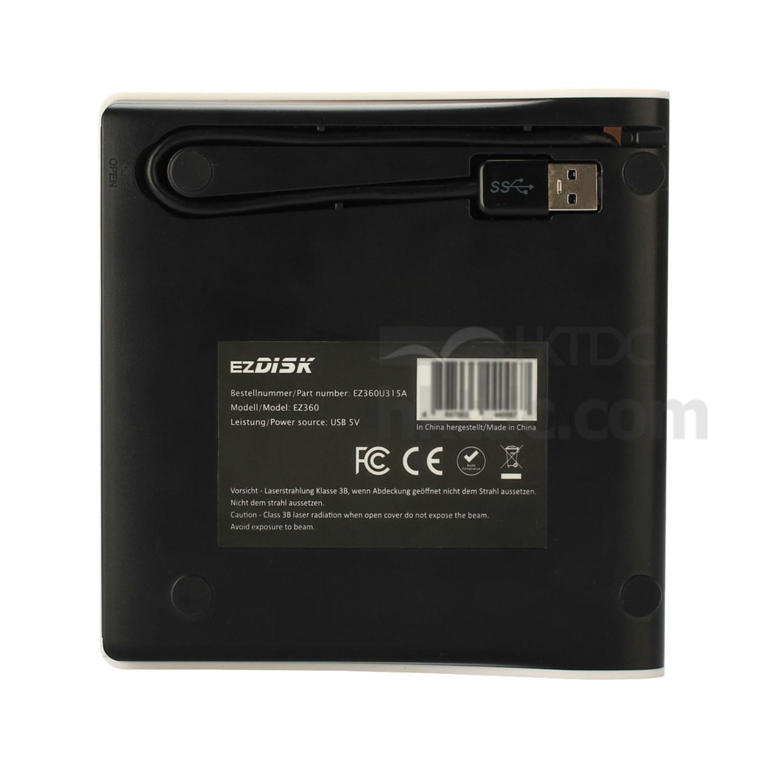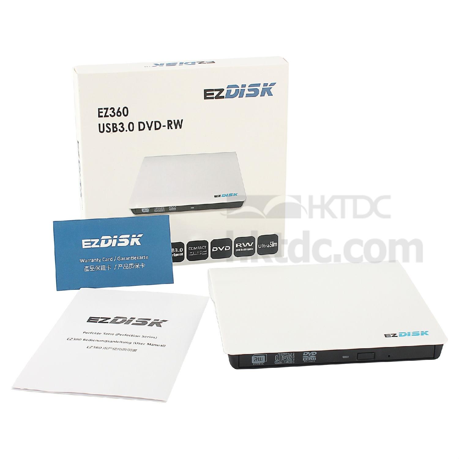 ezDISK EZ360 supports generic CD/CD-R/CD-RW; DVD Single and Double layer up to 9.4 GB; DVD±R (Ver 2.0 and 2.1); DVD±R DL (Ver 3.0); DVD±RW (Ver 1.1 and 1.2) and DVD-RAM. Supports CD read speed up to 24X and DVD read speed up to 8X. Support CD-R and CD-RW write speed up to 24X. Supports DVD±R write speed up to 8X, DVD±R DL write speed up to 2X, DVD±RW write speed up to 6X and DVD-RAM write speed up to 2X..