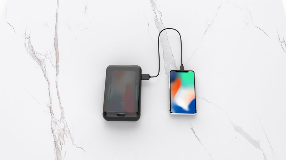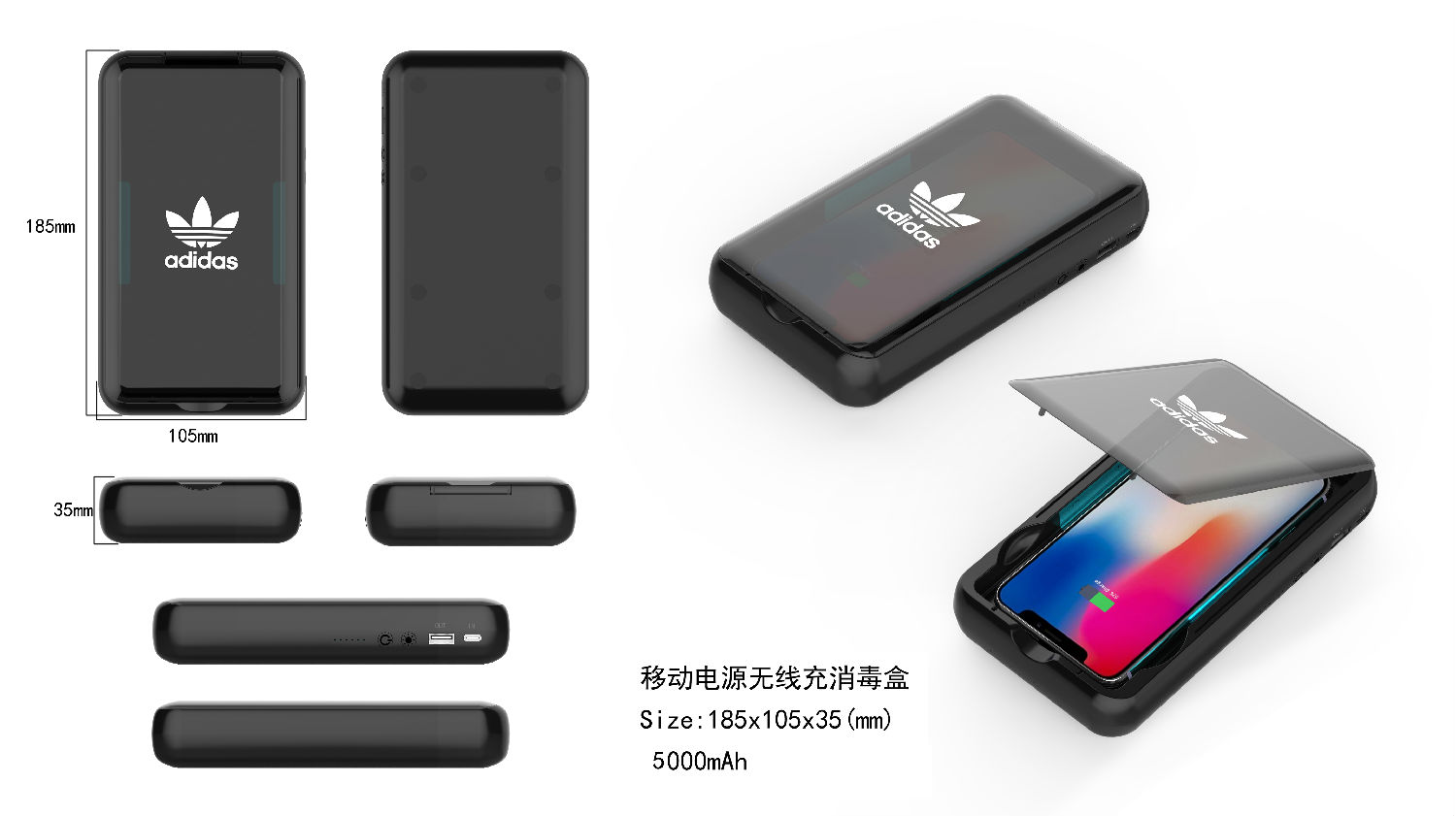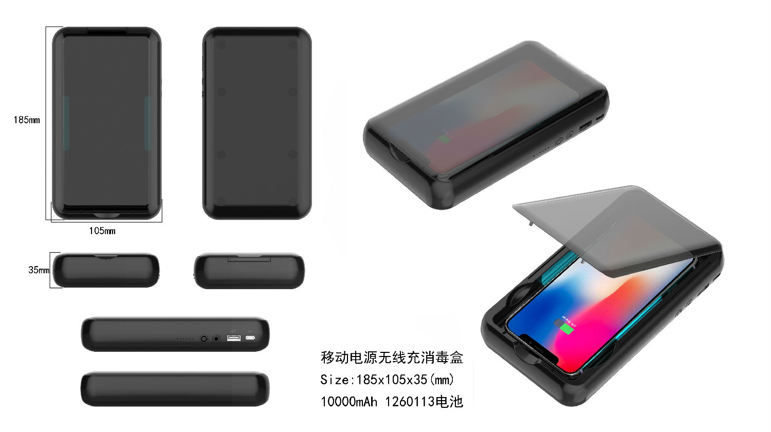 Material: ABS Product size:185*105*35mm Weight:284.5g Battery type:115570 Li-polymer 5000mAh; can do 10000mAh Type C input:5V/2A USB A output: 5V 2A Wireless output:5W UVC LED: 4PCS 1.2W