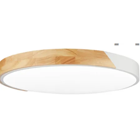 This round LED ceiling light features a novel splicing design with light - wood - grained and white parts on the lampshade. Its smooth, rounded lines are simple and natural, illuminating the living room and adding a warm touch to the space.