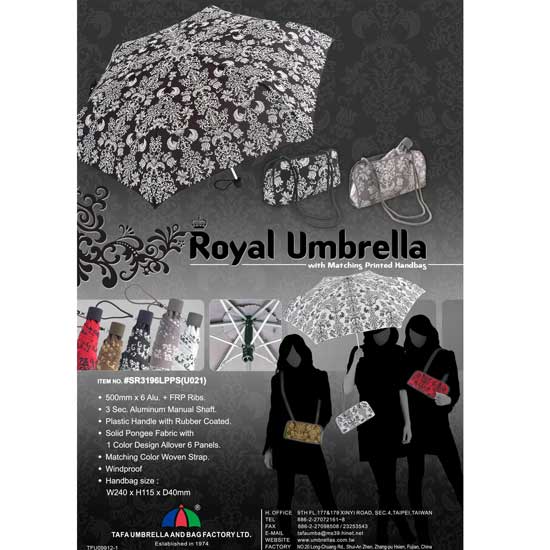 The highlighted umbrella and handbag set is printed with an artistic motif to enhance uniqueness. The included handbag comes with a long shoulder strap for easy carrying. This fashionable umbrella and handbag set is a great complement to ladies' wear.