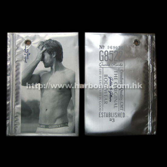 The underwear packaging bag features a model image with garment details at the back. It comes with a zigzag closure with a hole on the top for hanging on display rack. This packaging bag can be customized to suit your products.