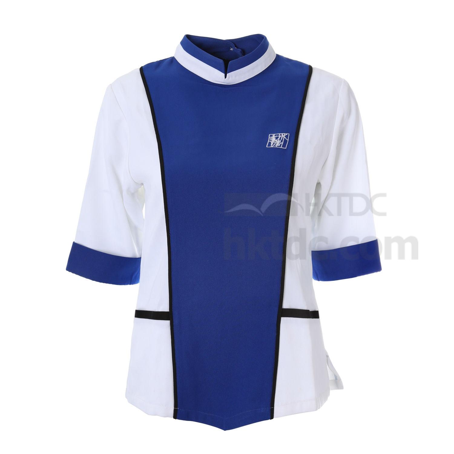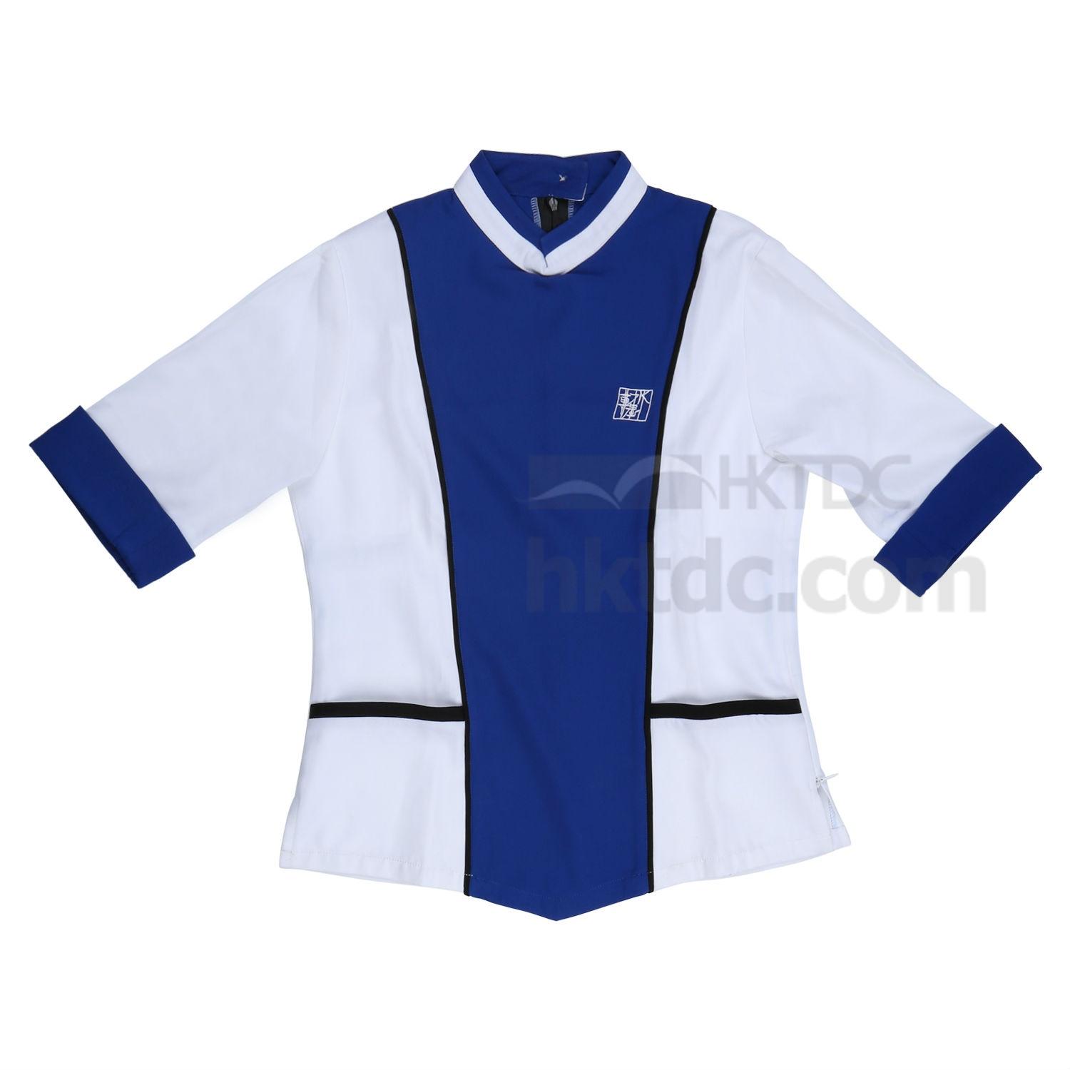 The short-sleeve bodice of this ladies’ uniform top comes in contrasting tone, featuring a stand collar for enhanced definition. Its folded cuffs and split side details further promises relaxed wear, suitable for work. A dainty logo is further seen on chest.