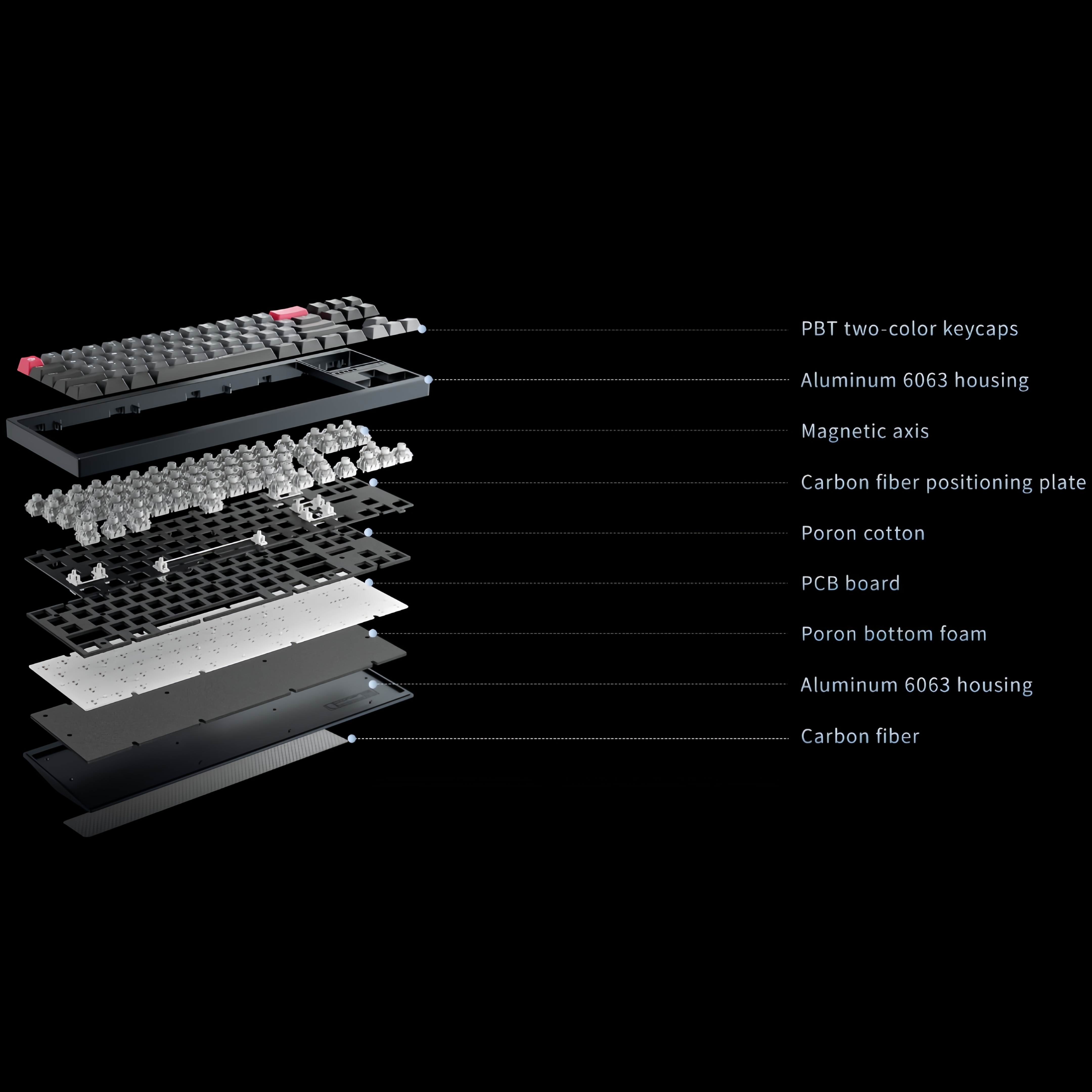 - Keycaps & Build: PBT Sublimation Keycaps resist wear and fading, preserving crisp legends for years. Inside, PRO Cotton inner padding dampens noise and adds a plush feel, while a Carbon Fiber Positioning Plate lends structural rigidity without compromising typing comfort.
