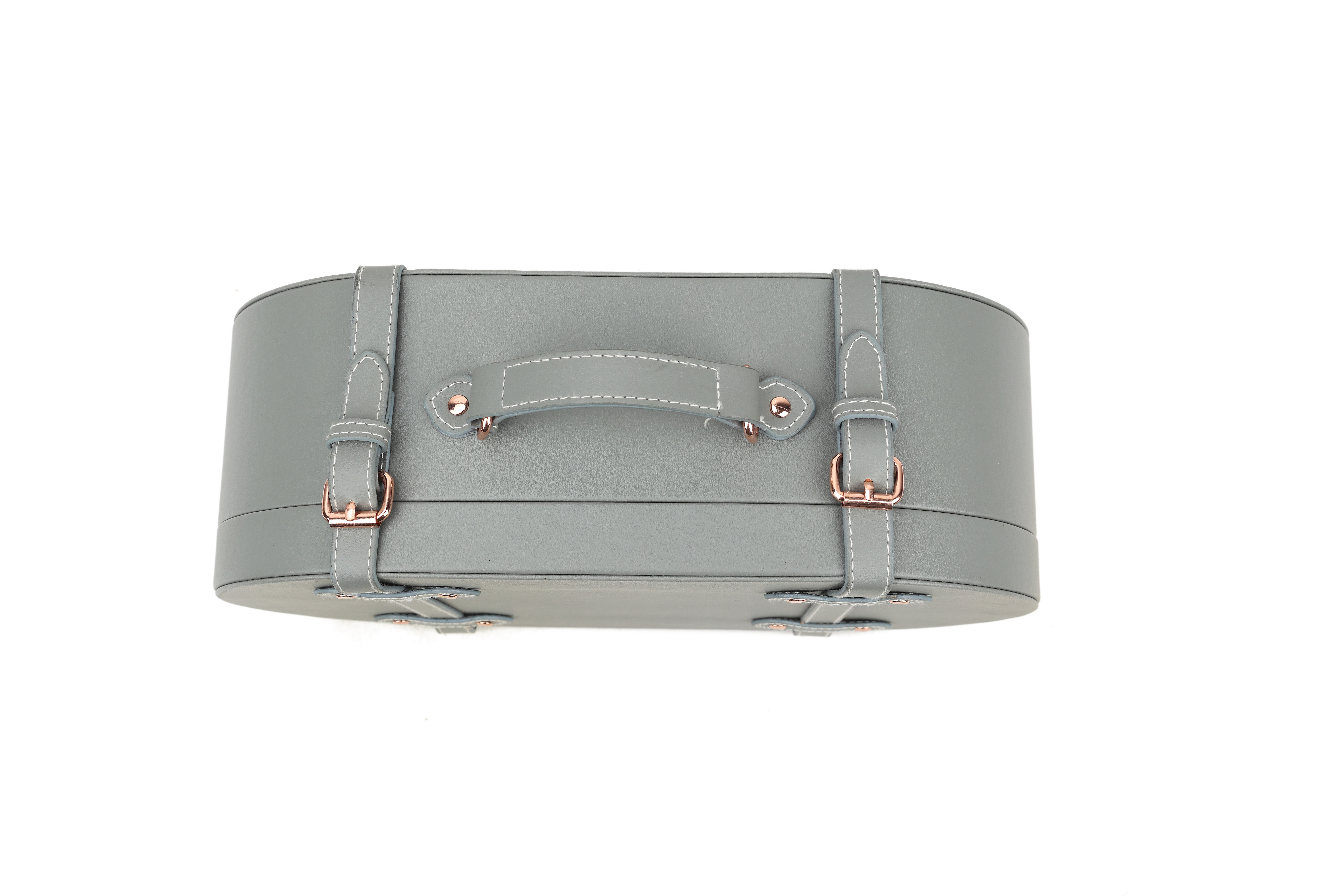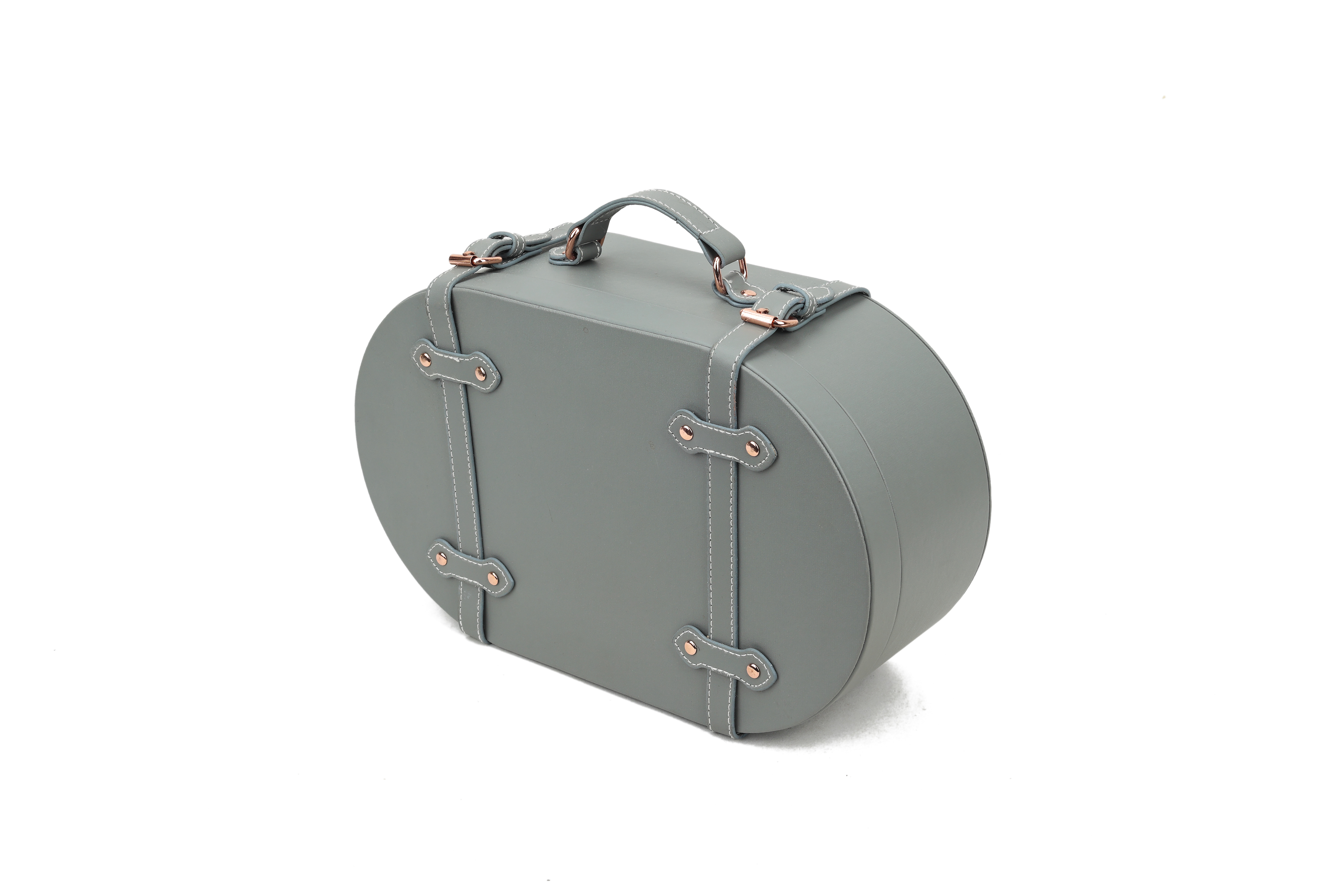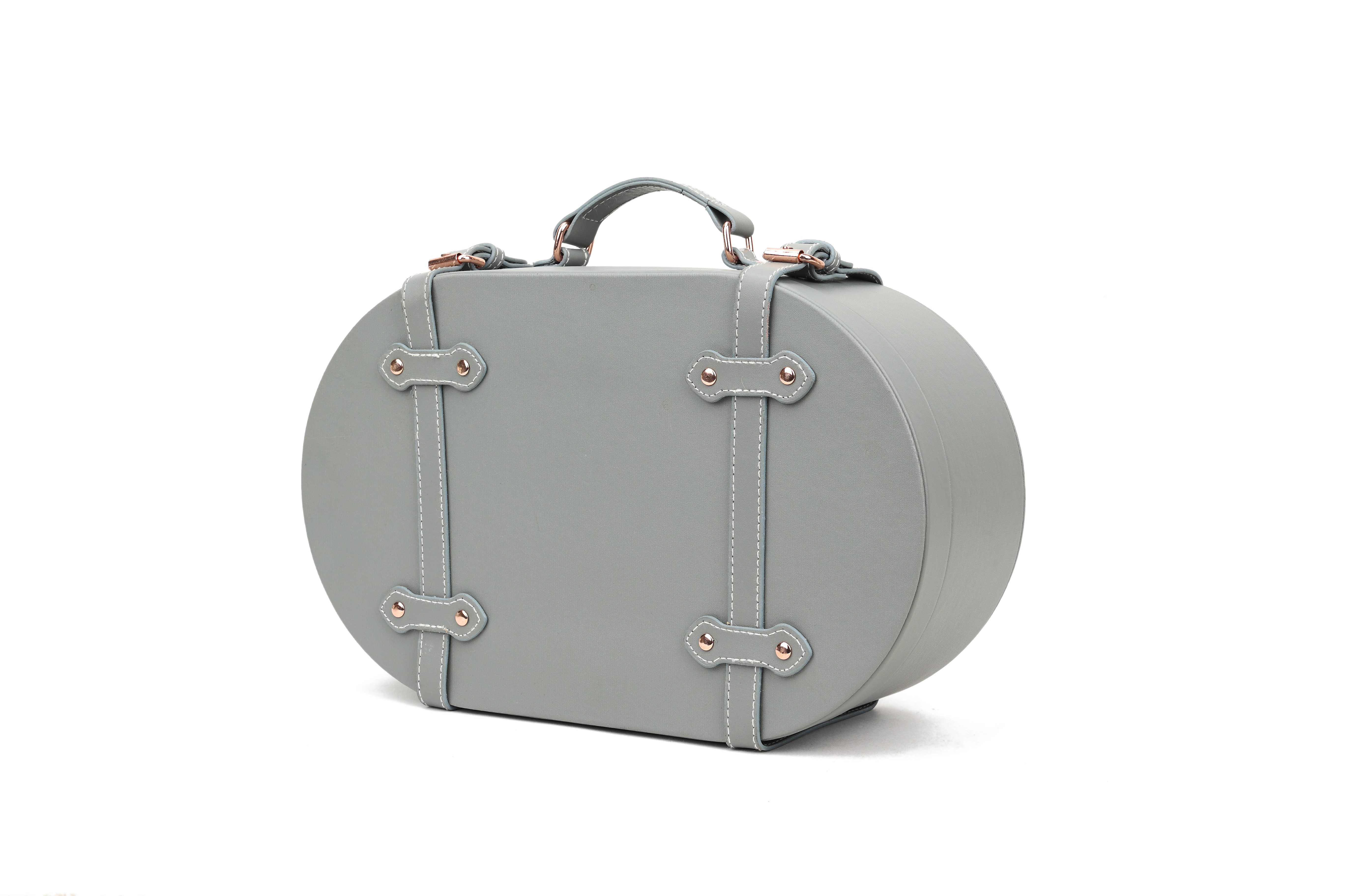 The unique oval leather box bag combines high-end gift packaging with practical fashion apeal,Designed as both a luxury presentation case and a stylish handbag, Features two decorative belt that elevate its visual texture while providing structural integrity