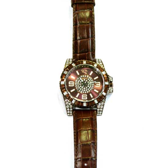This unisex analog watch is luxuriously adorned with dazzling stones at the case and dial. The round bezel features tube-shaped hour indices for added uniqueness. Present this elegant watch to your beloved.