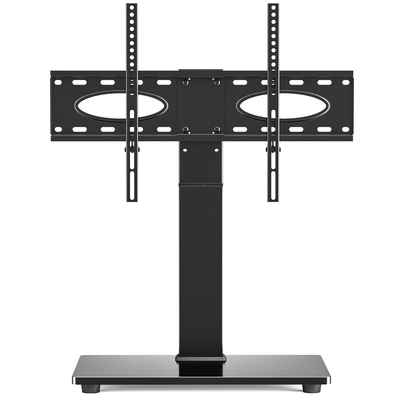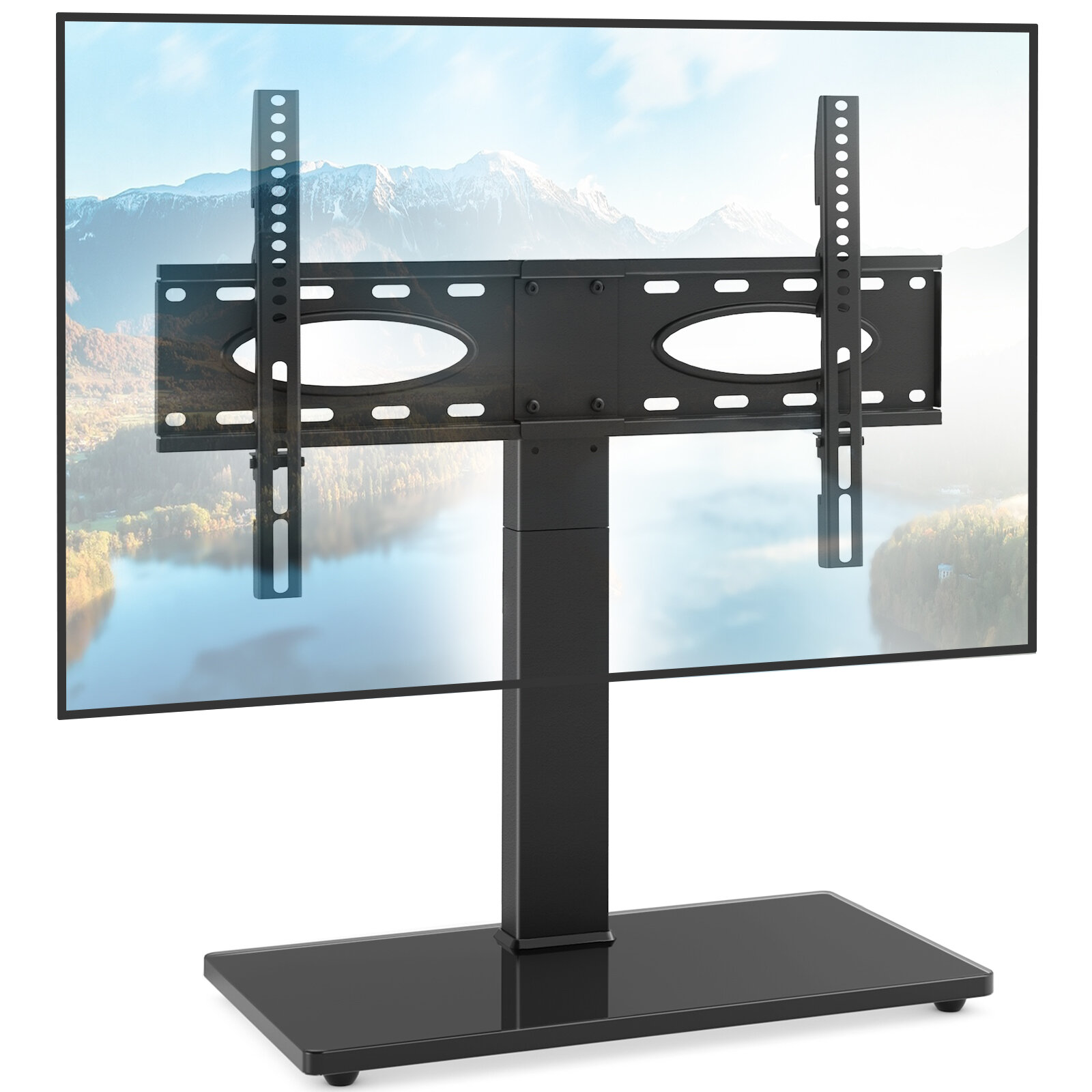 • [STURDY AND SAFE DESIGN]-- The table top TV stand is made of heavy duty alloy steel and quality-looking tempered glass base, providing security and stability when mounting your devices up to 110lbs. There are 4 pieces of non-slip rubber pads on the bottom to keep the stand on the table/desk more stable. Installation of safety locks in mounting brackets can effectively prevent the television from falling off from the stand.