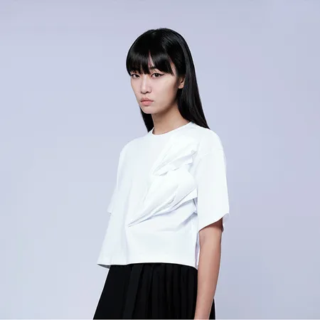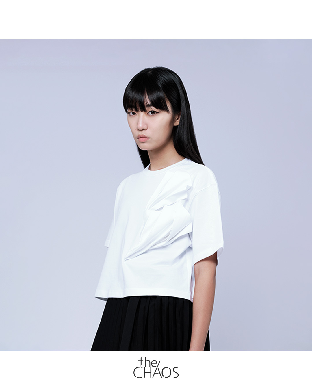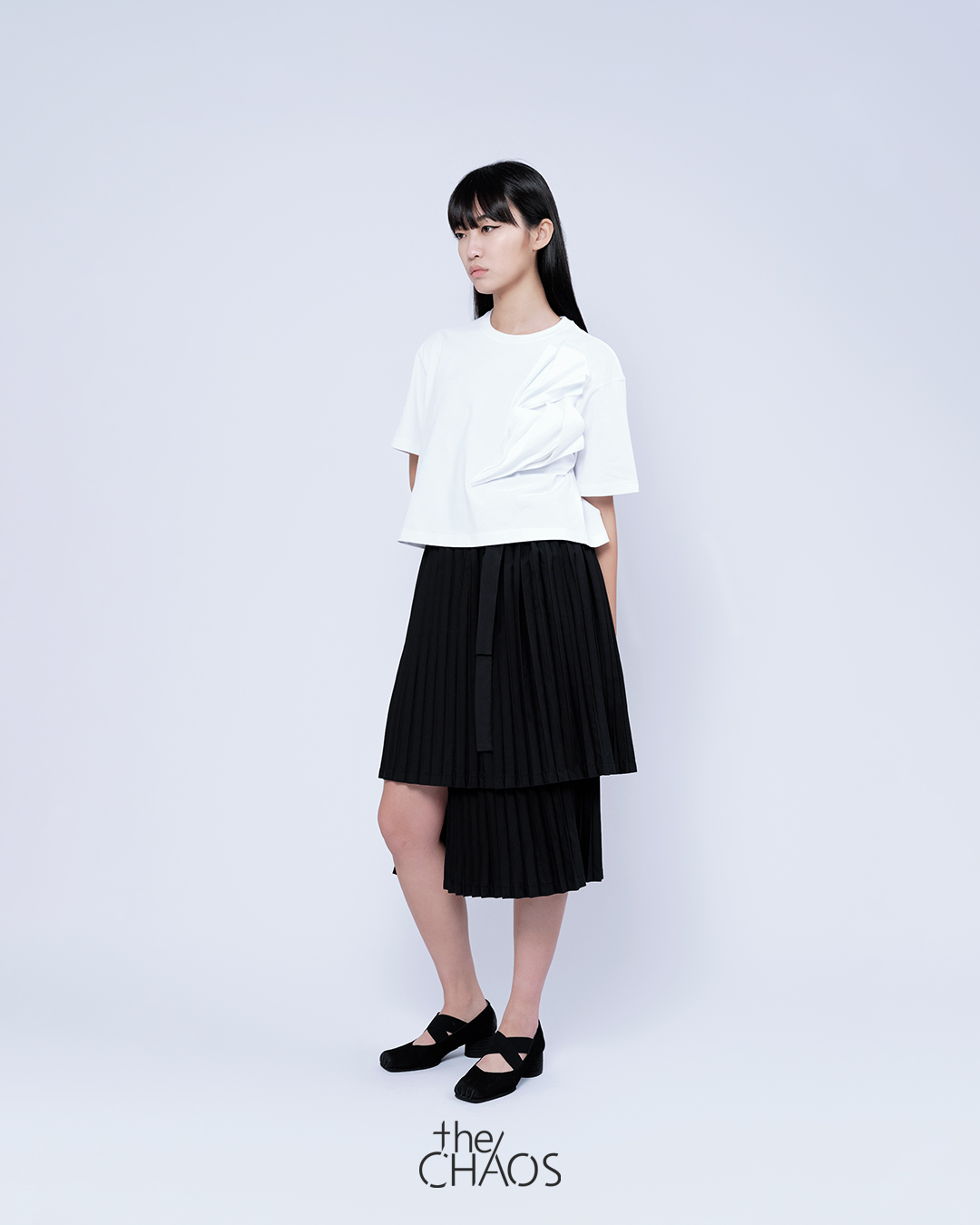 The White Upcycled 3D Flow Sculpture Croo Tee in cotton jersey , upcycled from a deadstock tee is one of a kind. Styling with the modular zero-waste pleated wrap skirt .