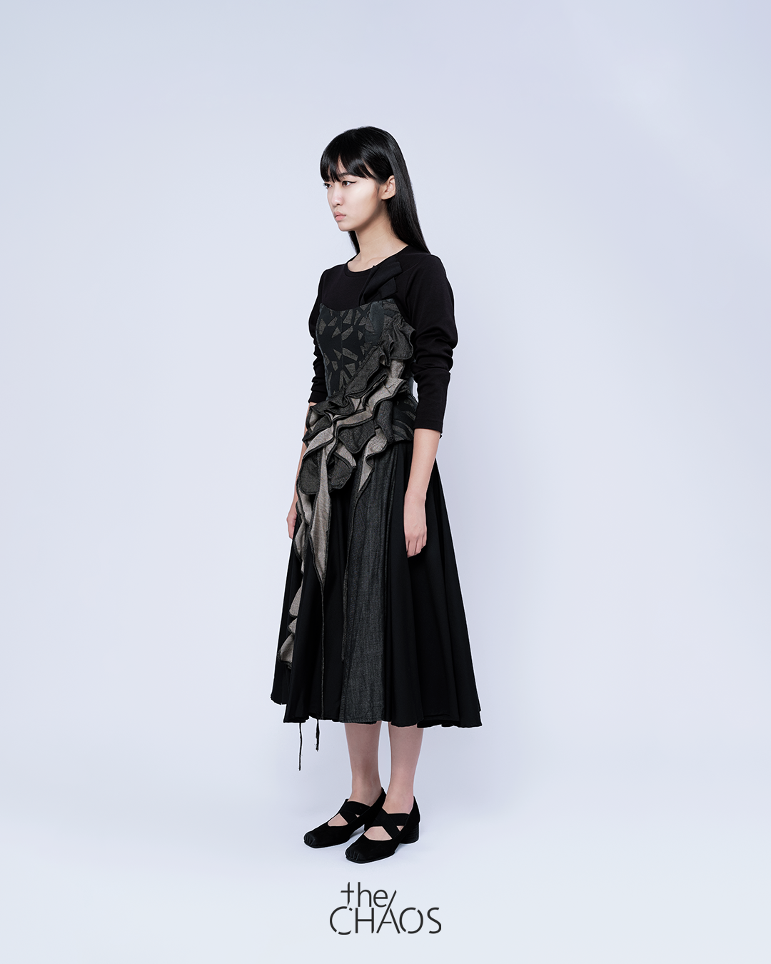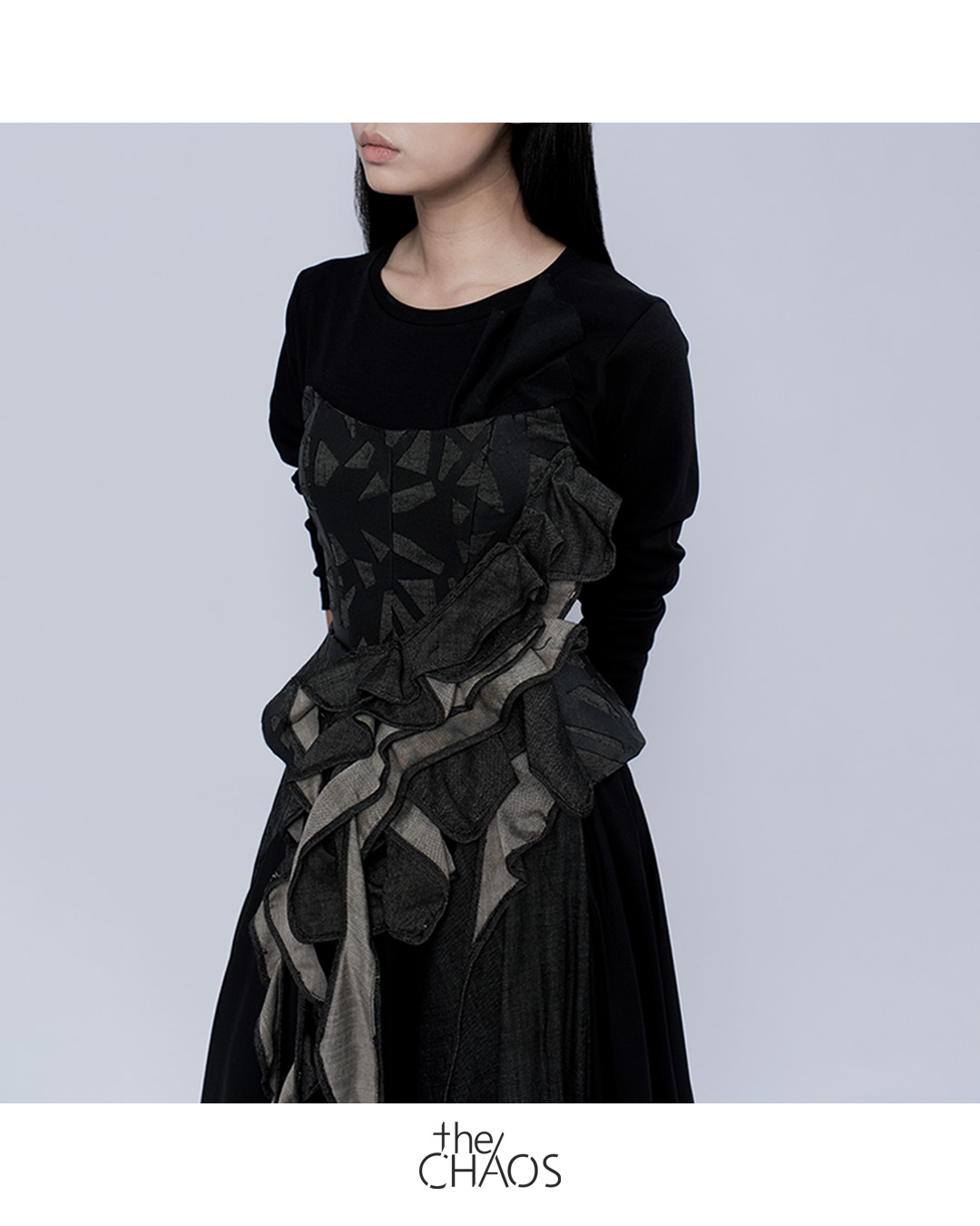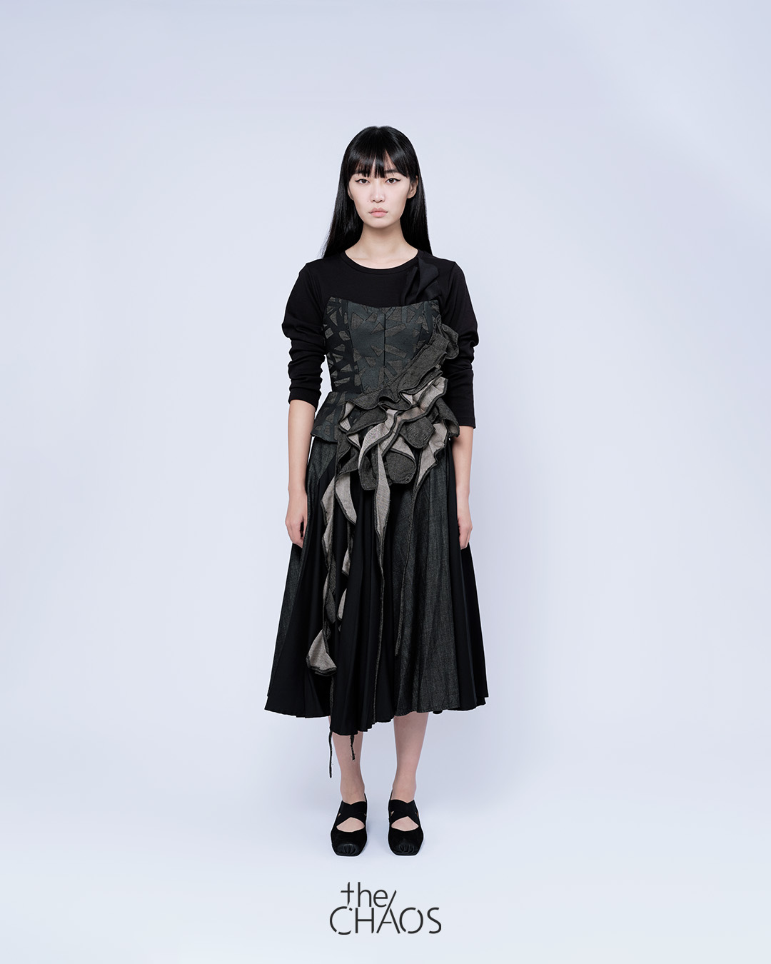 Upcycled sedimentary rock inspired corset in end-of-roll denim from RDA collection. Styling with ‘Time pause’ inspired twisted flare skirt and black upcycled 3D flow sculpture tee