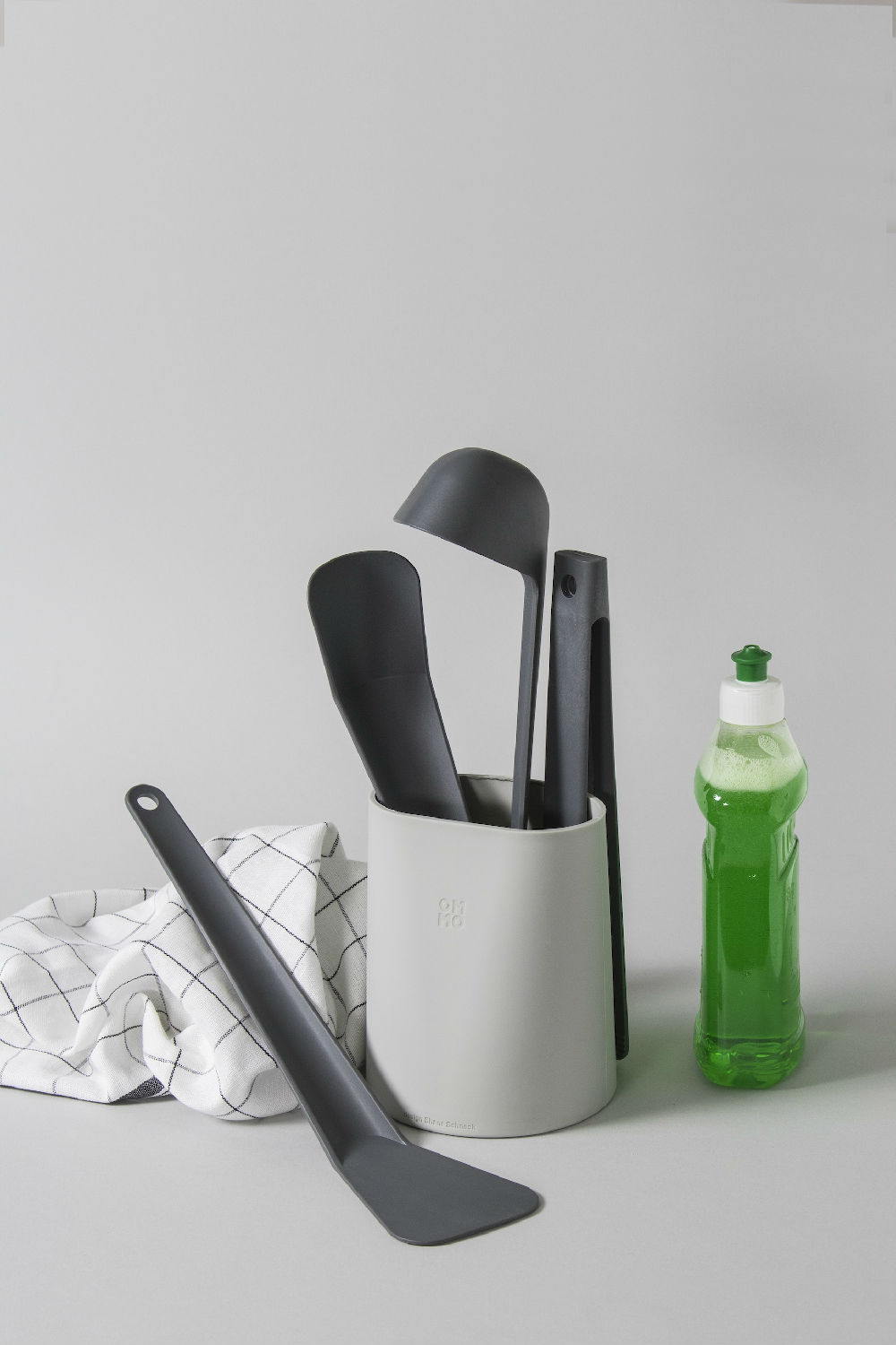 The tool set comes with the main kitchen utensils including tongs, turner, spoon and ladle.