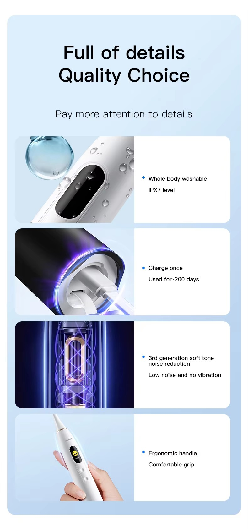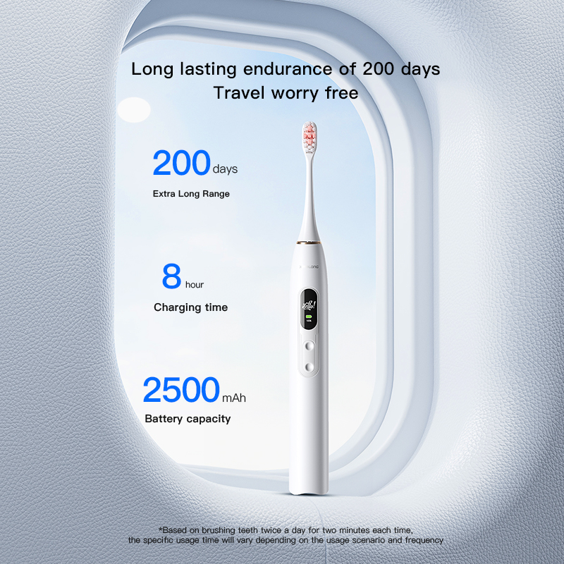 Enjoy 120-day battery life on a single charge, perfect for travel. With IPX7 waterproof protection, you can use it worry-free in the shower. The built-in pressure sensor safeguards your gums, preventing excessive force while brushing.